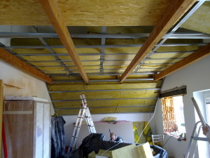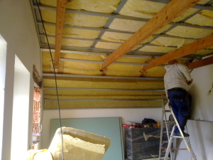 Zateplení střechy, izolace Isover RD Řitka – Praha západ, montáž tepelné izolace Isover UNI tl. 210 mm, Isover UNIROL PROFI 160, mm U 0,108 (W.m-2.K-1) odpovídá zateplení nízkoenergetickému zateplení střechy, montáž sádrokartonových konstrukcí Rigips stropní podhled 4.70.14 VK 11 jednoduché opláštění RF (RFI) 15 mm požární odolnost REI 30 minut, vlez JAP Lusso PP. |