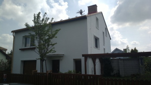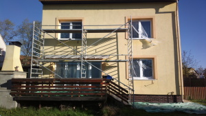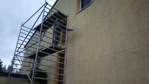 Fasáda Praha 5 - Sobín, nátěr a napuštění fasády odstraňovačem řas, mechů a lišejníků – W003. Biologický roztok k čištění a ochraně proti řasám, plísňovým houbám, mechům a lišejníkům. Omytí fasády tlakovou vodou, Weber.ton bio - protiplísňový fasádní nátěr bílý, stavba a bourání lešení. |