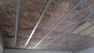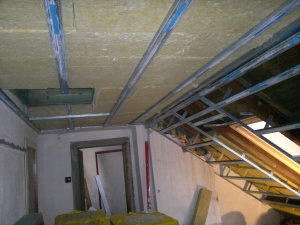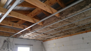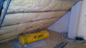 Zateplení střechy, izolace Isover RD Řitka – Praha západ, montáž tepelné izolace Isover UNI tl. 210 mm, Isover UNIROL PROFI 160, mm U 0,108 (W.m-2.K-1) odpovídá zateplení nízkoenergetickému zateplení střechy, montáž sádrokartonových konstrukcí Rigips stropní podhled 4.70.14 VK 11 jednoduché opláštění RF (RFI) 15 mm požární odolnost REI 30 minut, vlez JAP Lusso PP. |