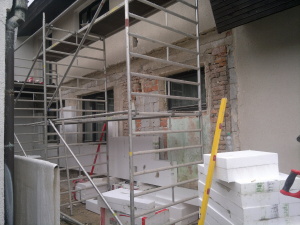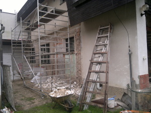 Fasáda Praha 5 - Sobín, nátěr a napuštění fasády odstraňovačem řas, mechů a lišejníků – W003. Biologický roztok k čištění a ochraně proti řasám, plísňovým houbám, mechům a lišejníkům. Omytí fasády tlakovou vodou, Weber.ton bio - protiplísňový fasádní nátěr bílý, stavba a bourání lešení. |