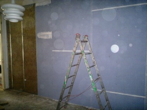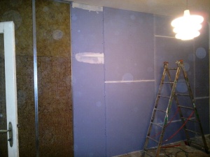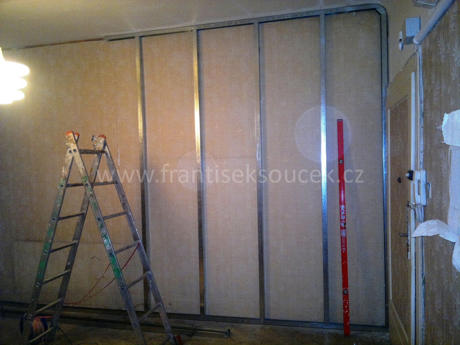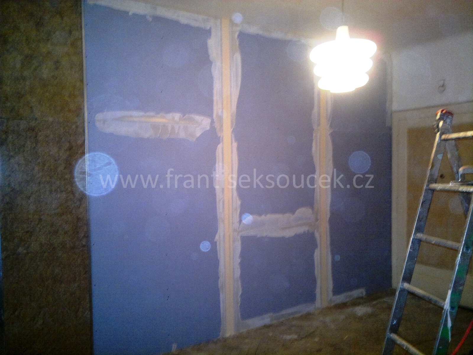 Sádrokartonářské práce Praha 6, Dejvice, Akustická sádrokartonová předsazená stěna, modrá sádrokartonová deska MA 12,5 mm, (modré ticho), akustická izolace MPE 40 mm.