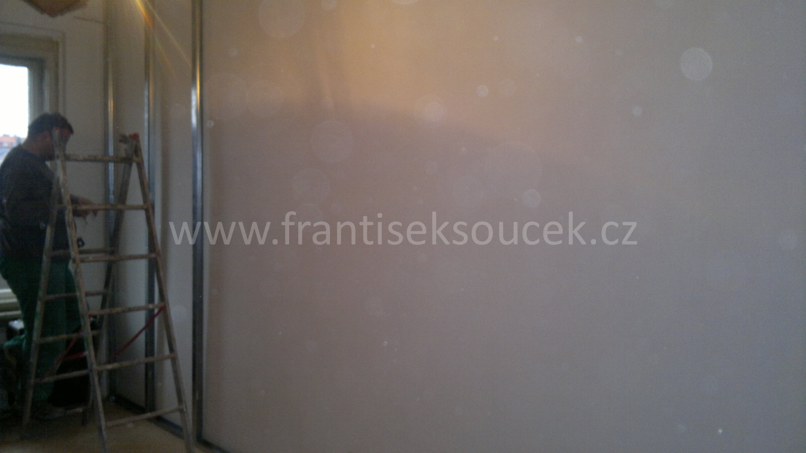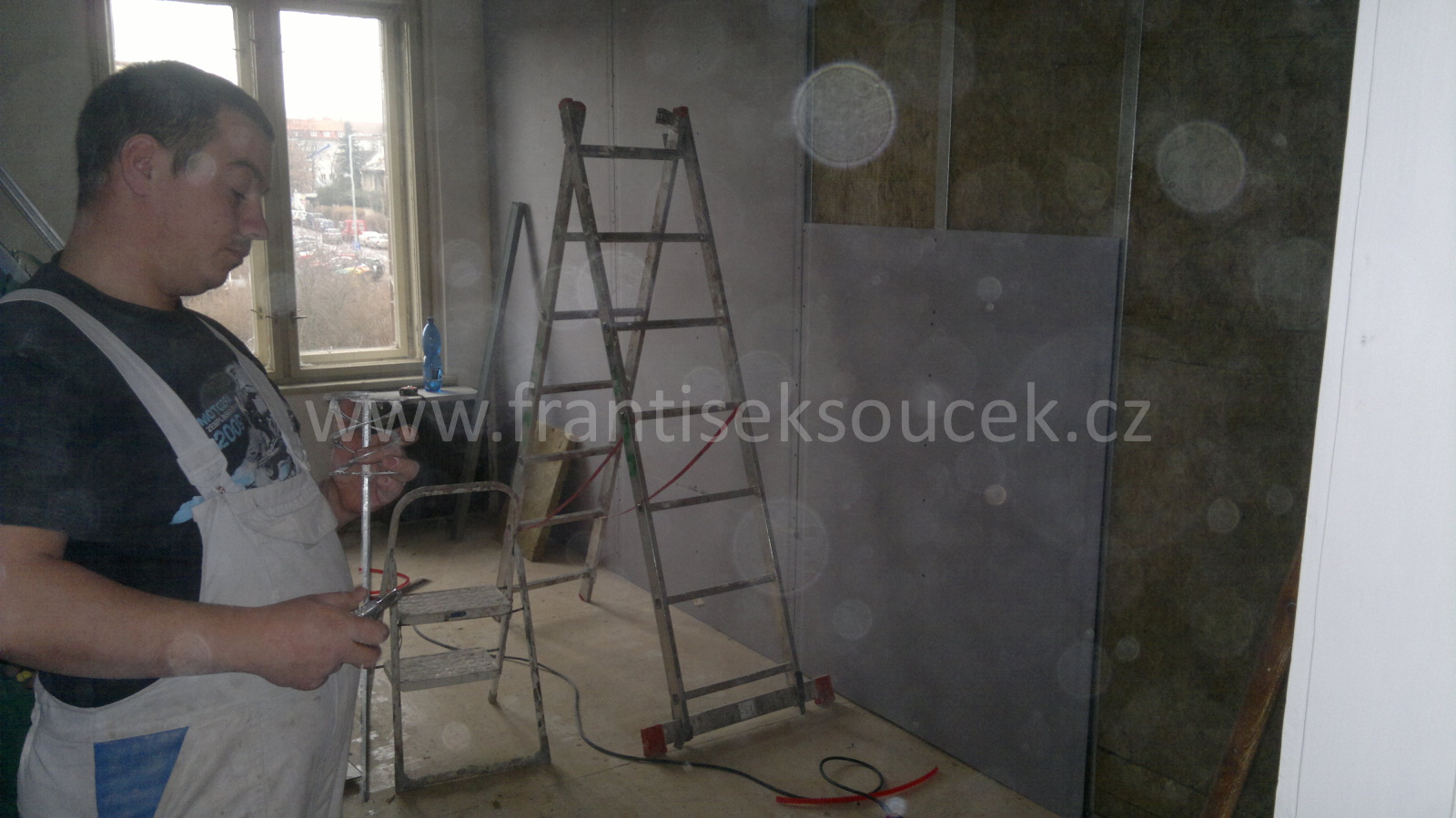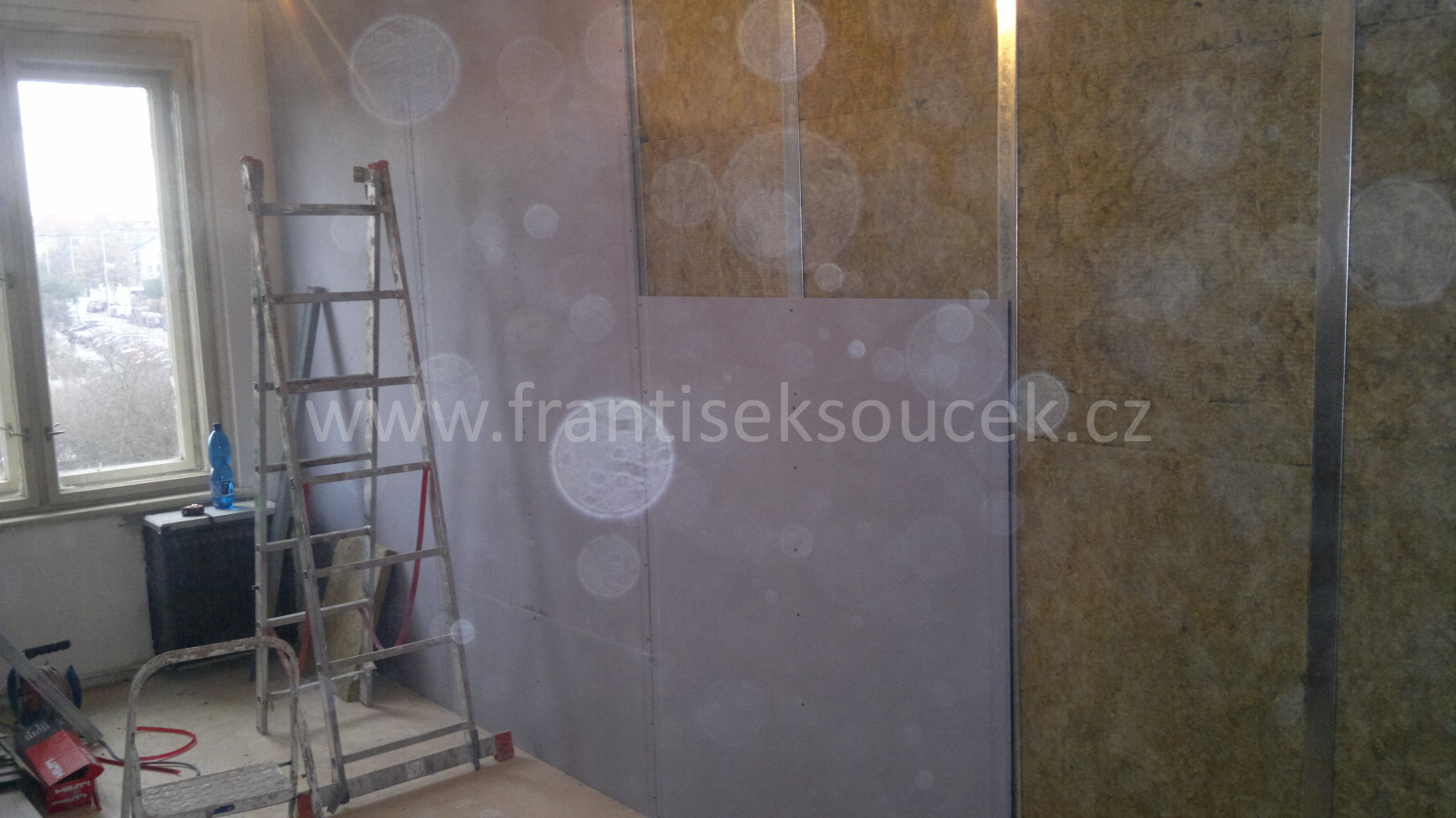 Montáž sádrokartonových konstrukcí Praha 10, Strašnice, Akustická sádrokartonová předsazená stěna , modrá sádrokartonová deska 3.22.00 MA OK 12, dvojitě opláštěná (modré ticho), akustická izolace MPE 40 mm.
