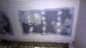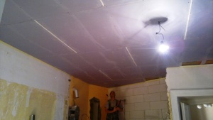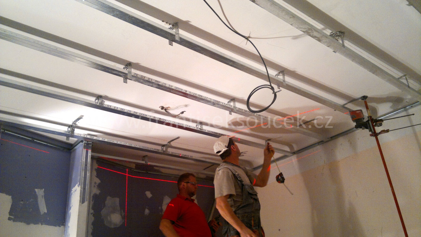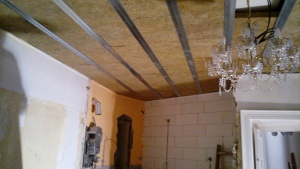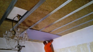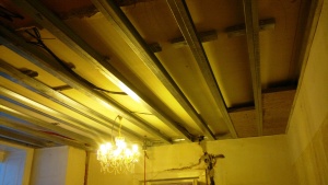 Modré akustické systémy, Praha 1 - Josefov, Maiselova ulice, protihluková ochrana staveb, akustické podhledy Rigips - opláštění stropu přímo montované - akustické, stropní konstrukce D 131 na UW a CW profilech opláštěno deskou Knauf Diamant 12,5 mm (nabízí ještě vyšší zvukově izolační schopnosti), sádrokartonová vestavba, příčka opláštěná deskou Knauf Diamant, příprava pro montáž vestavěné skříně a knihovny, kastlík ze sádrokartonové konstrukce. Kvalita provedení Q3, doba realizace 6 dní cca 92 m2. |