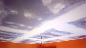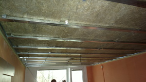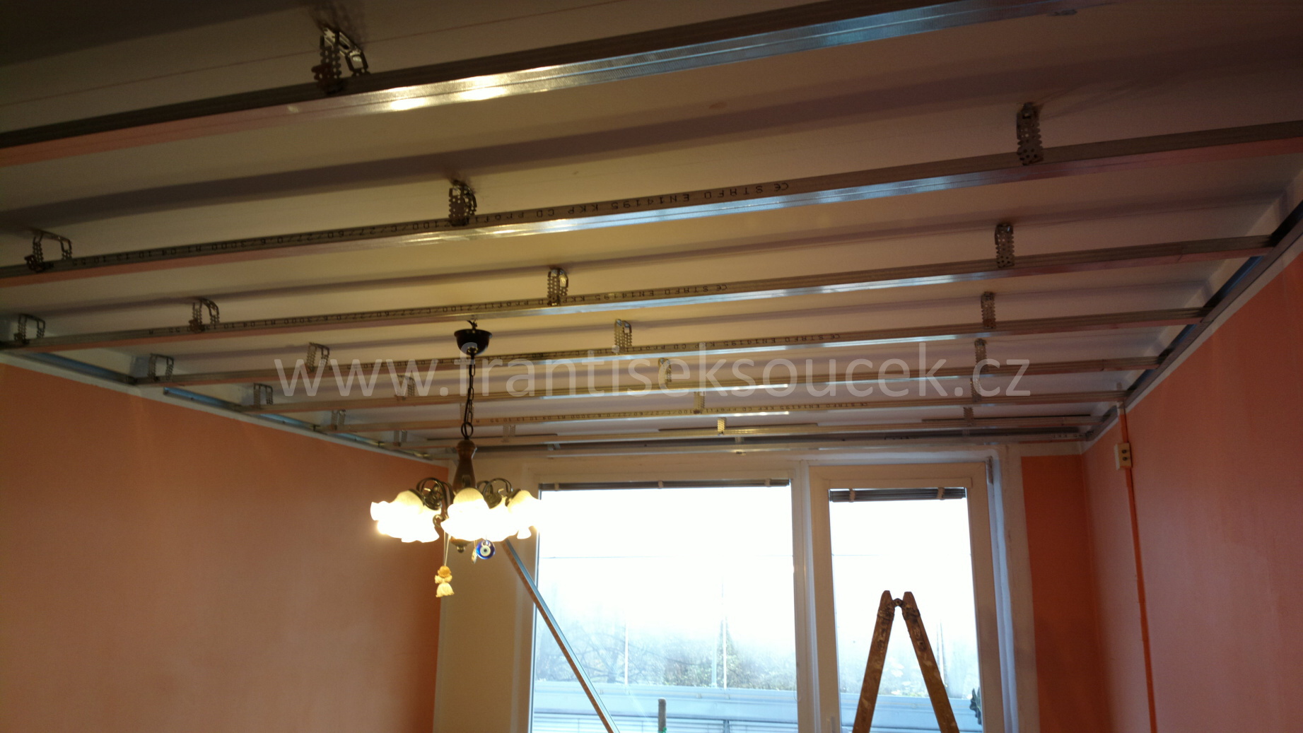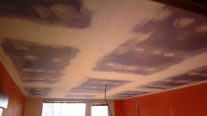 Montáž modré ticho Rigips, Praha 8 - Střížkov, protihluková ochrana staveb modrý akustický systém Rigips, dodání a montáž sádrokartonového akustického podhledu opláštěného sádrokartonovou modrou deskou Rigips MA 12,5 mm v panelovém domě zvuková neprůzvučnost Rw 60 db, 18 m2, 1 1/2 dne montáž, sádrová stěrka na stěnách Knauf Geltband. |