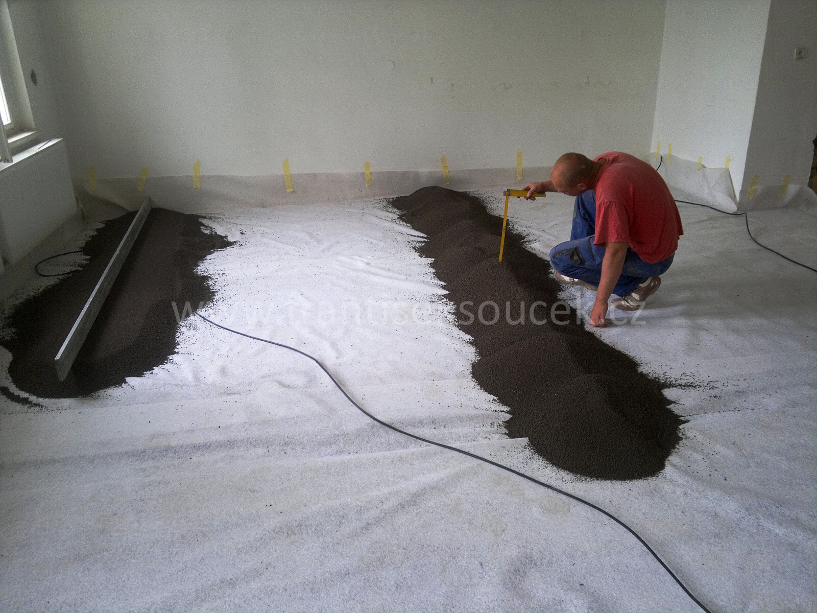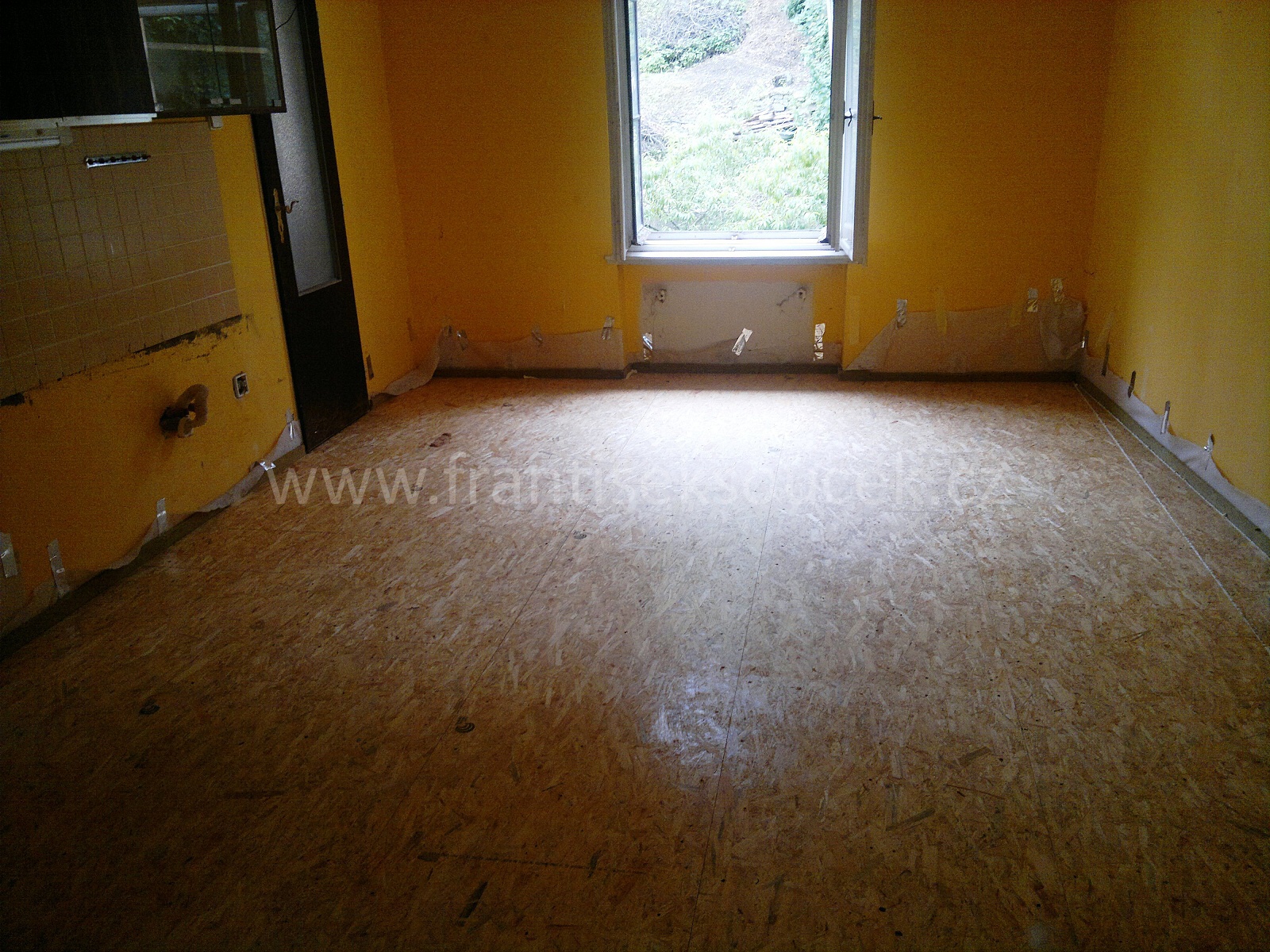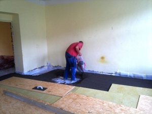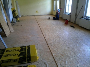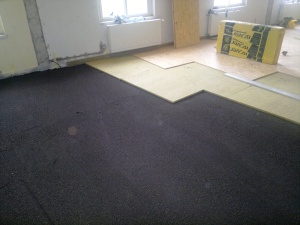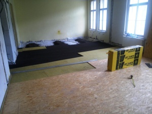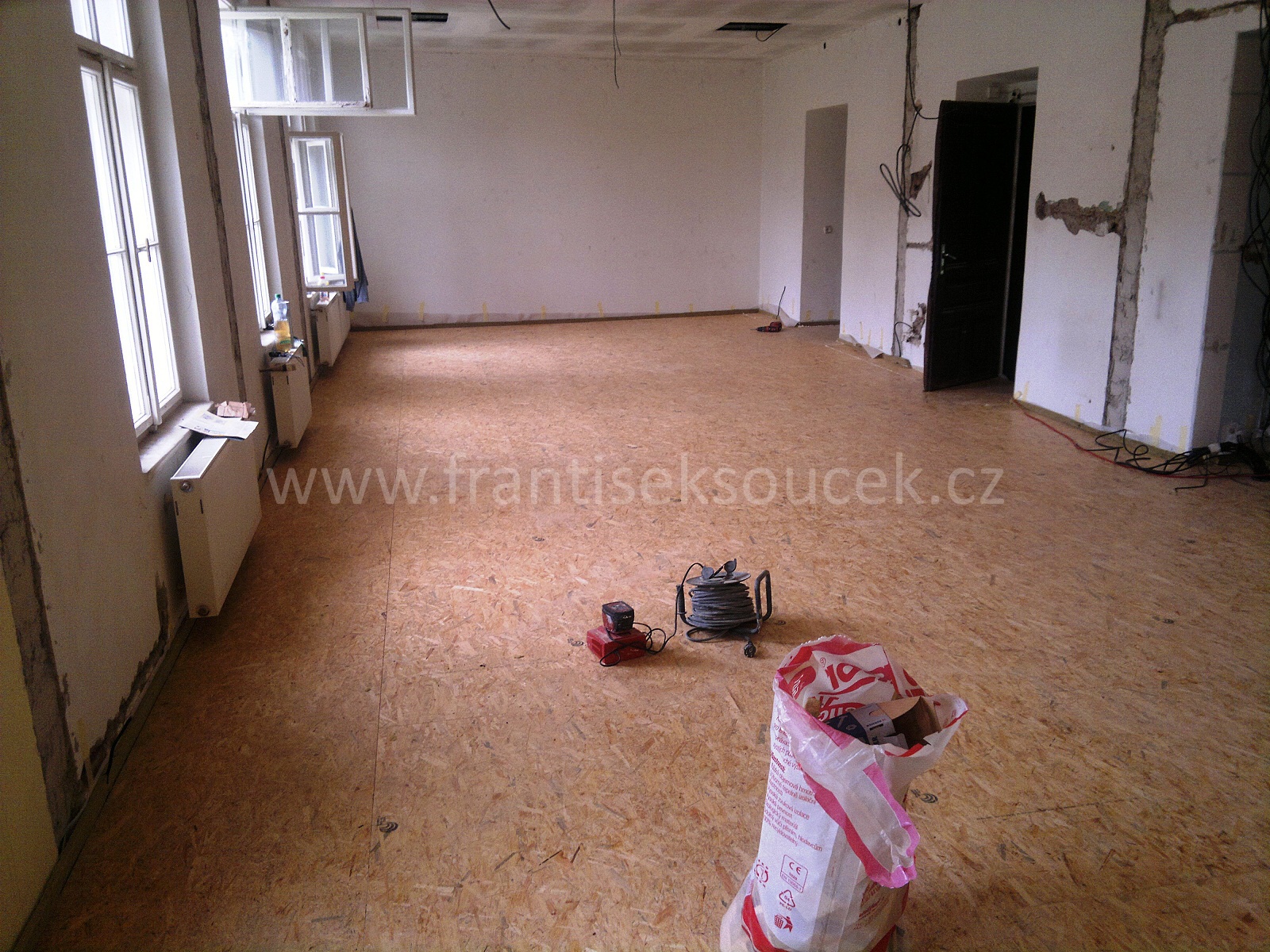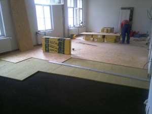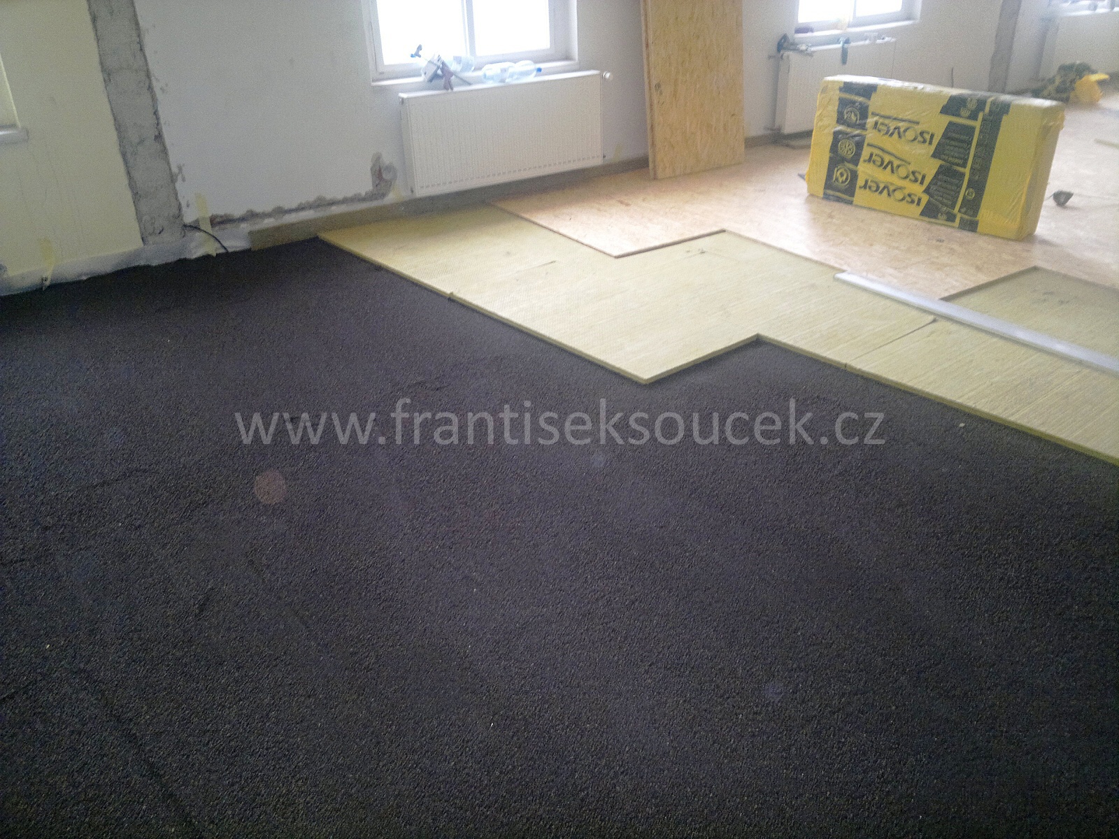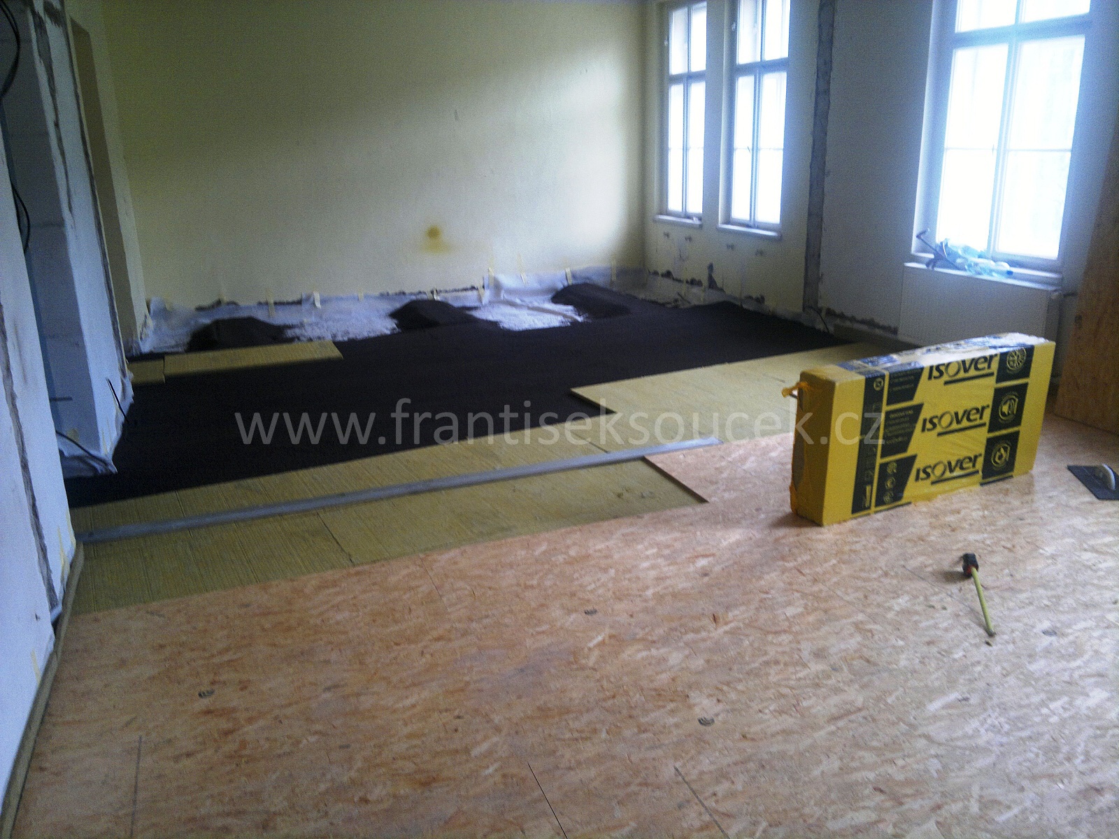 Montáž suché podlahy Praha 5 - Radlice, srovnání podkladu podsypem Liapor o 100 mm, akustická izolace Isover T - P 25 mm, 2 x OSB PD 12 + 15 mm. Neprůzvučnost RW 55 db.