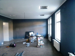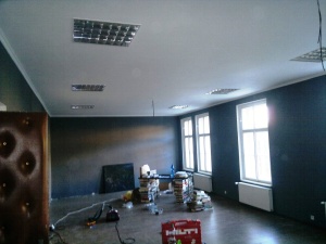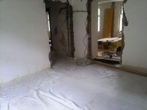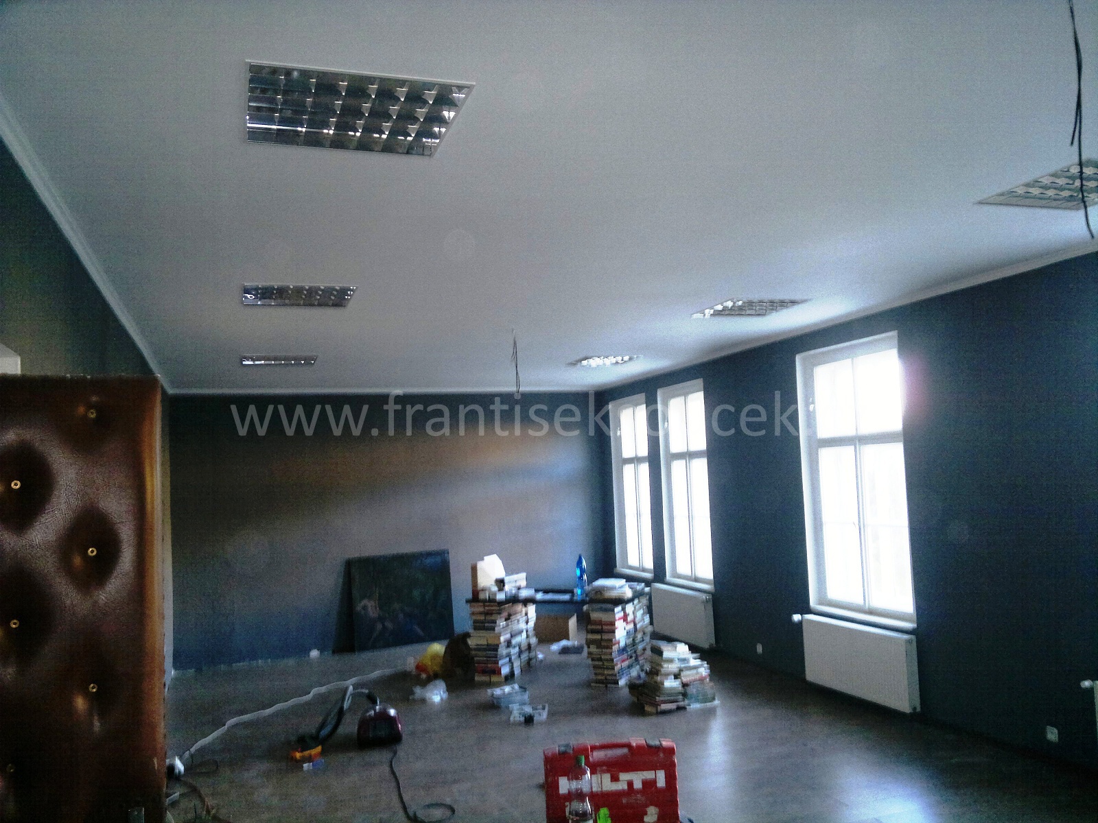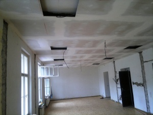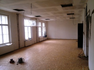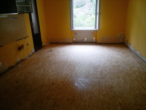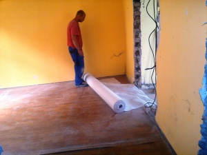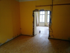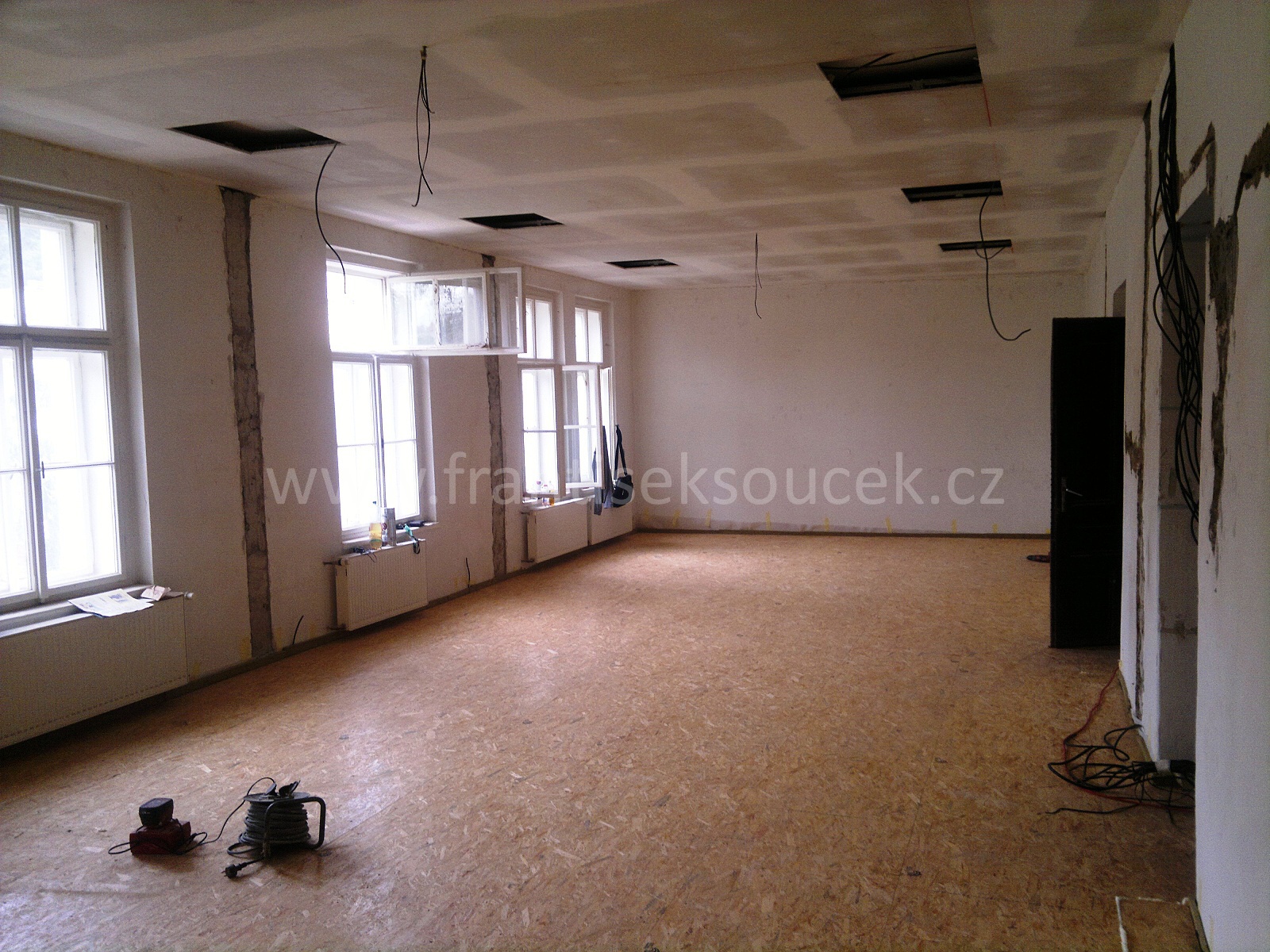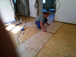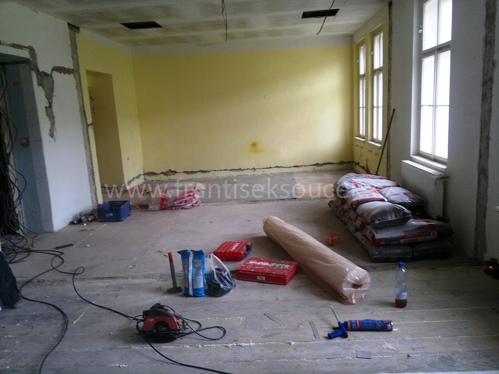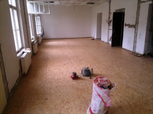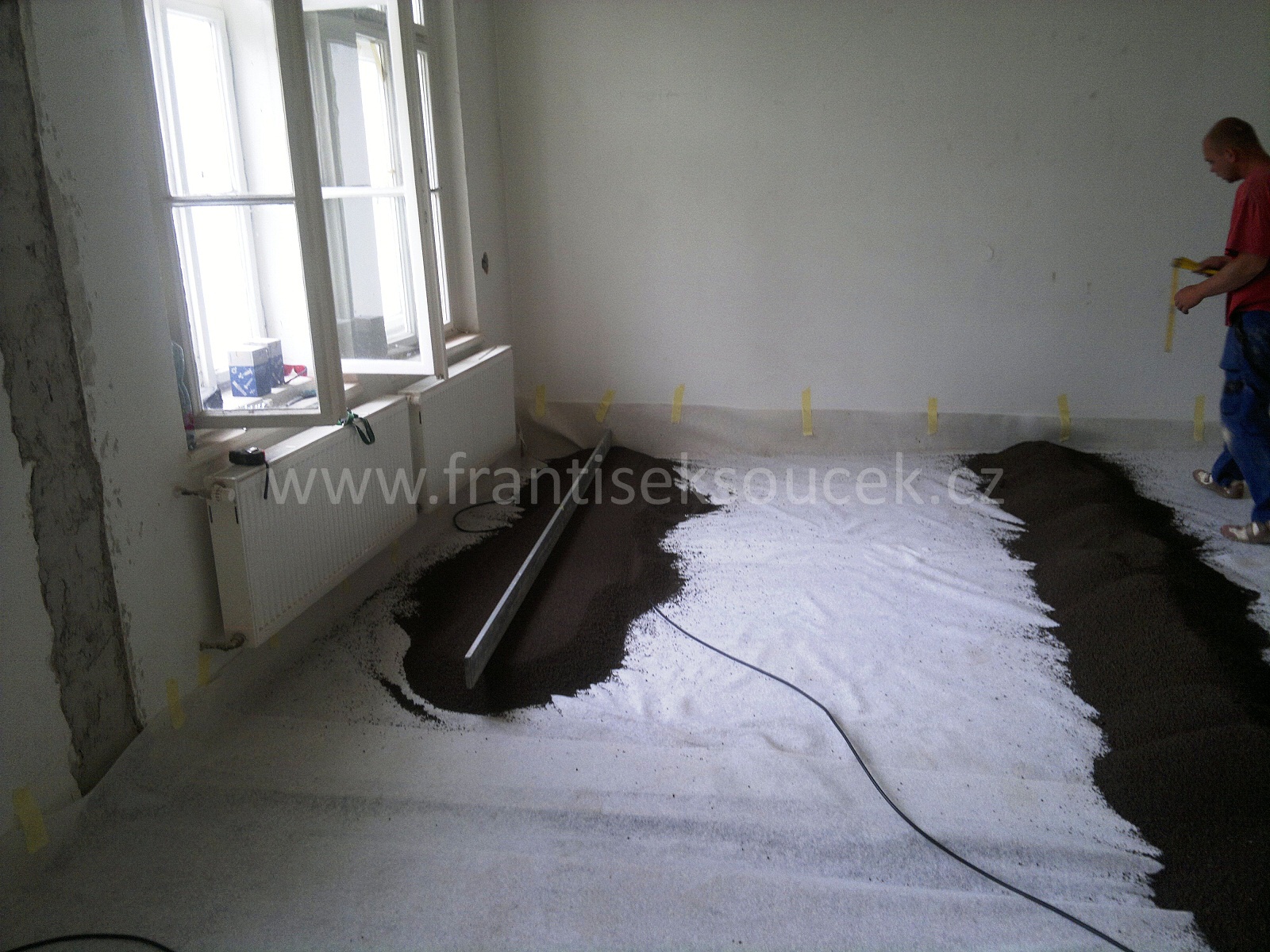 Montáž suché podlahy Praha 5 - Radlice, srovnání podkladu podsypem Liapor o 100 mm, akustická izolace Isover T - P 25 mm, 2 x OSB PD 12 + 15 mm. Neprůzvučnost RW 55 db.