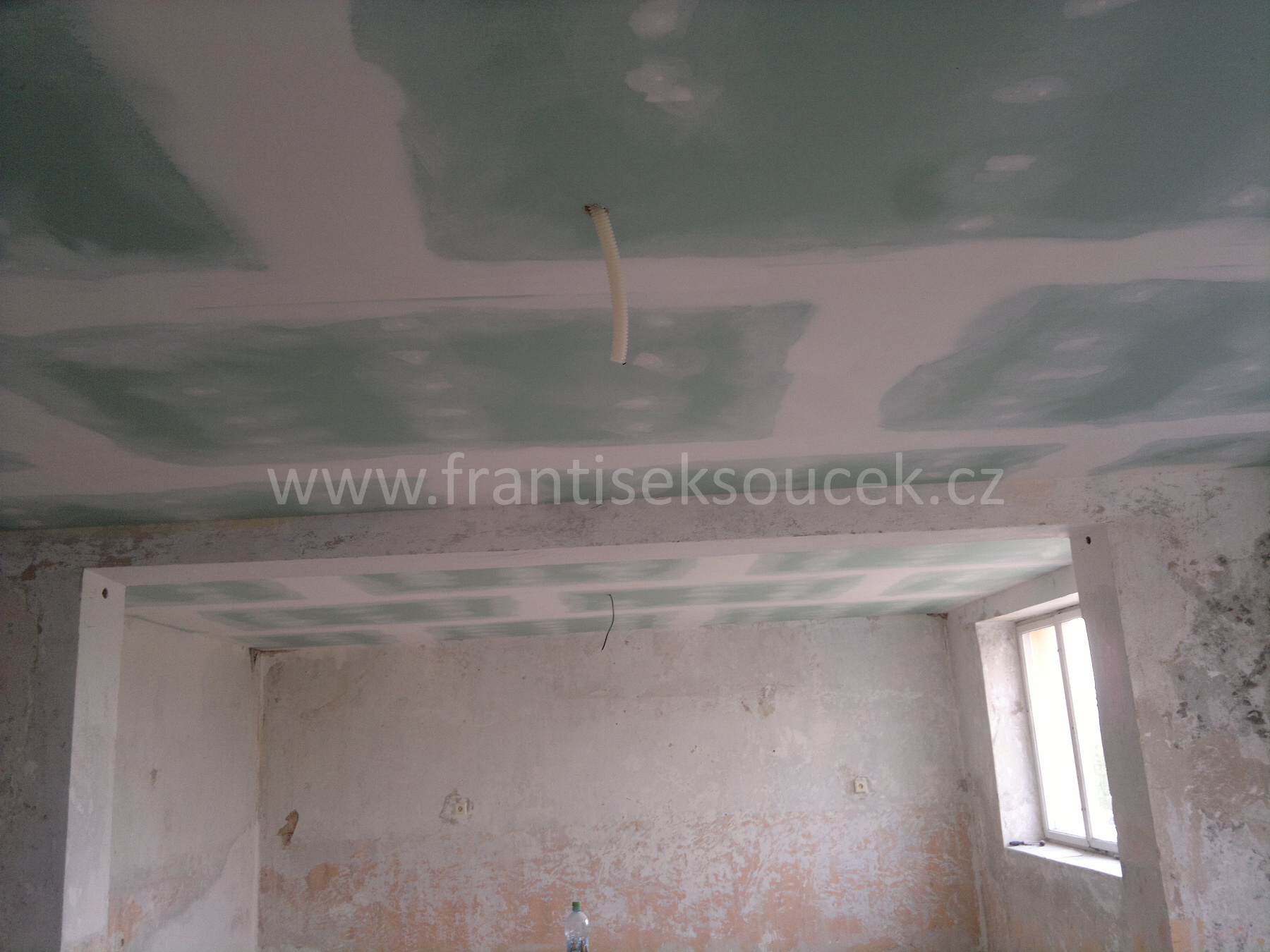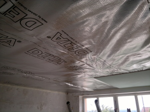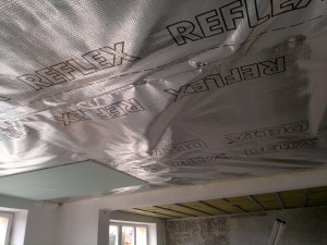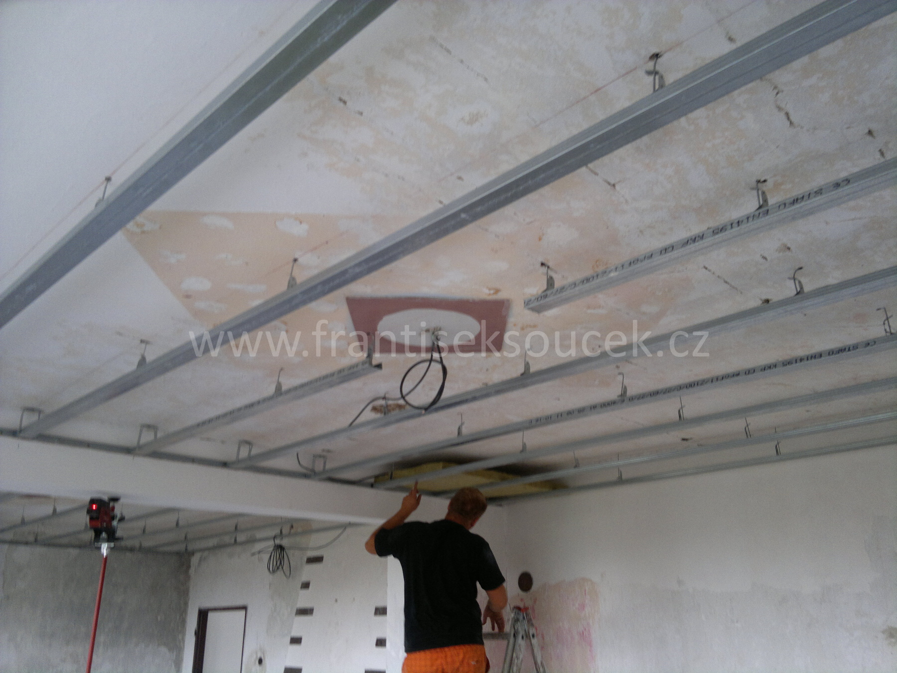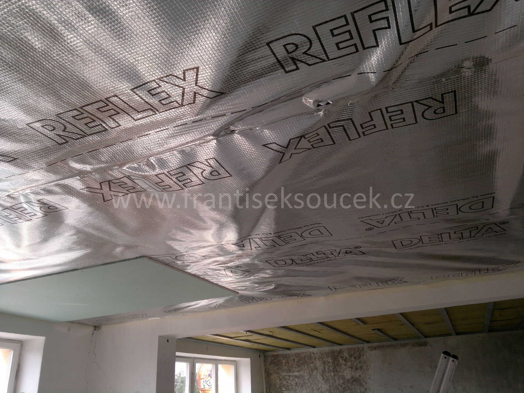 Obec Hradčany, kulturní dům Beseda montáž sádrokartonového podhledu 4.05.23 s vloženou izolací a parozábranou Delta fol reflex 45 m2, 3,5 dne.