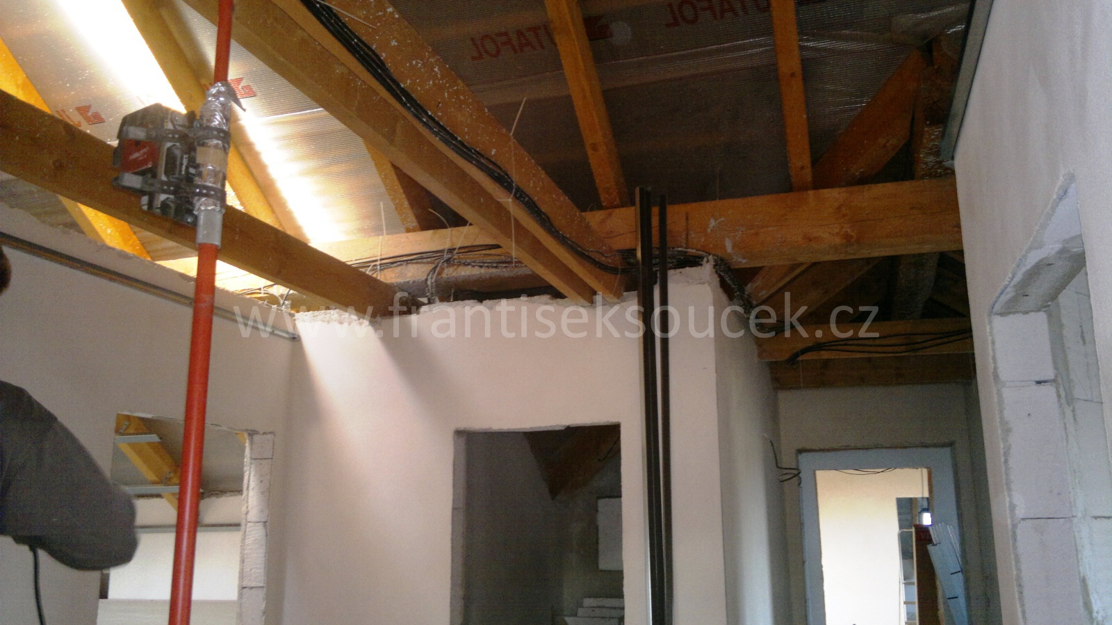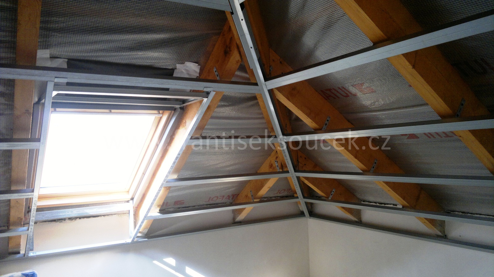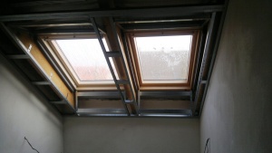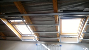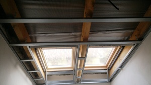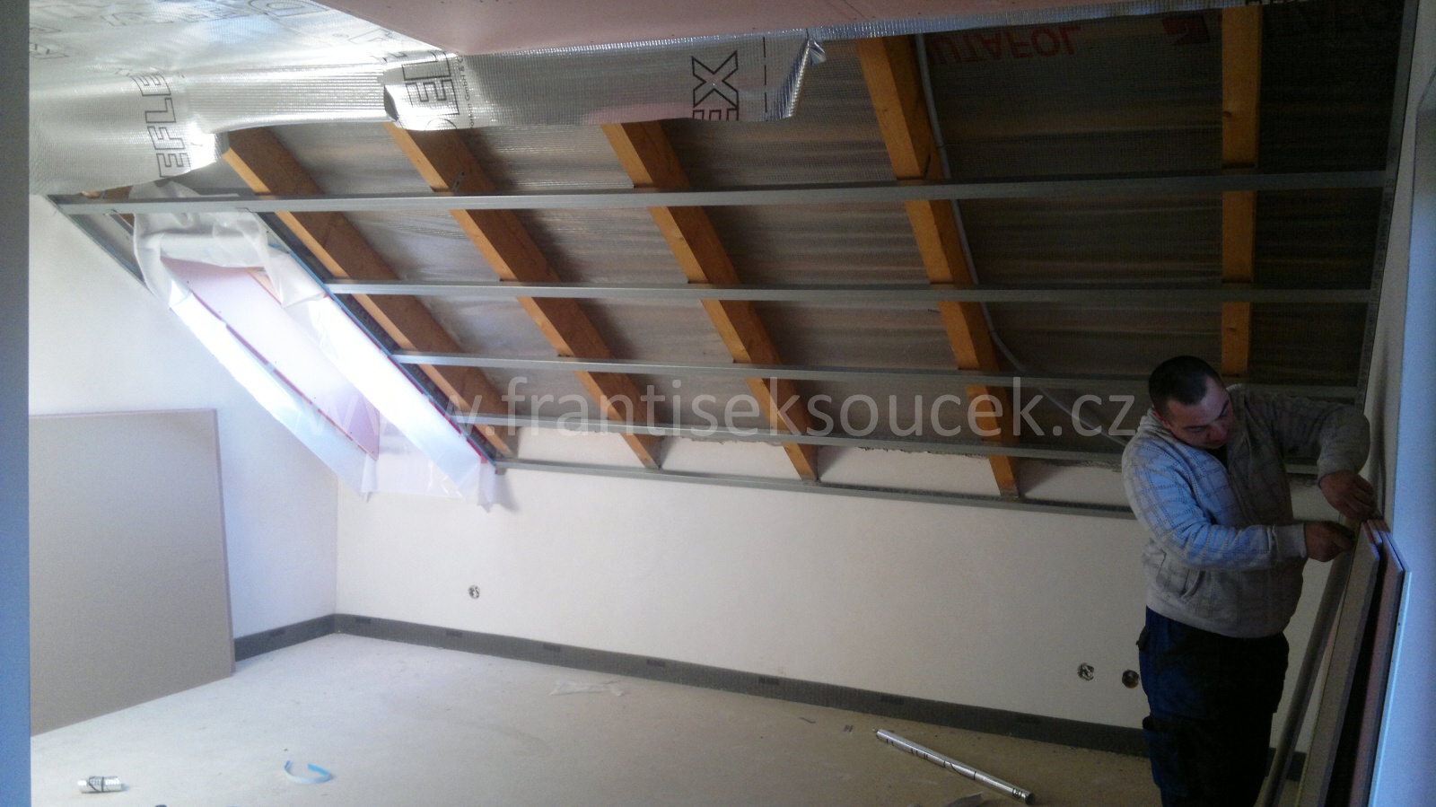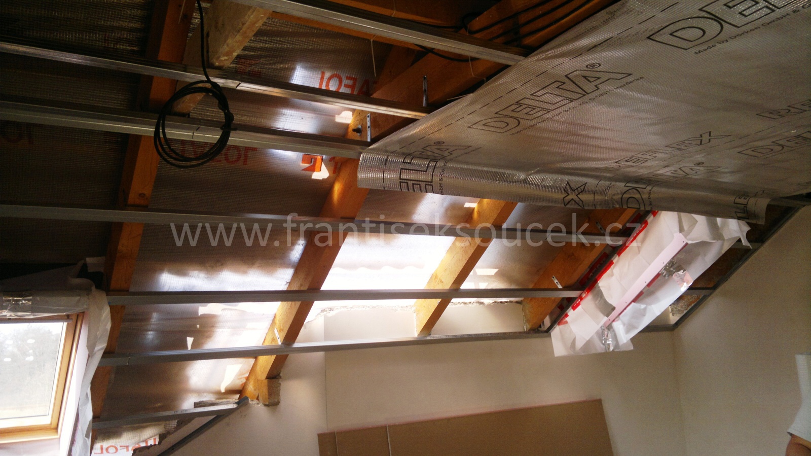 Dolní Břežany – Praha západ, montáž sádrokartonových konstrukcí Rigips, příprava pro montáž „chytré izolace, podkroví a stropní podhled 4.70.14 VK 11 jednoduché opláštění sádrokartonovou deskou RF (RFI) 12,5 mm požární odolnost REI 15 minut, 170 m2, montáž sádrokartonového opláštění okolo střešních oken Velux včetně parotěsné manžety, montáž parotěsné folie DELTA FOL REFLEX, vlez JAP Lusso ZP. |