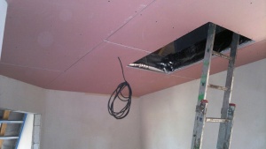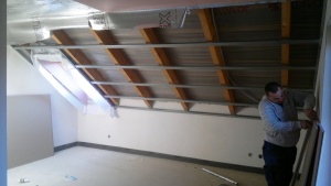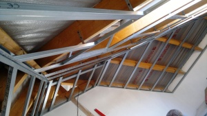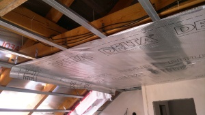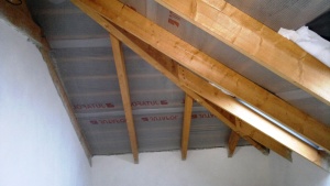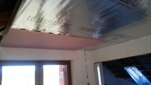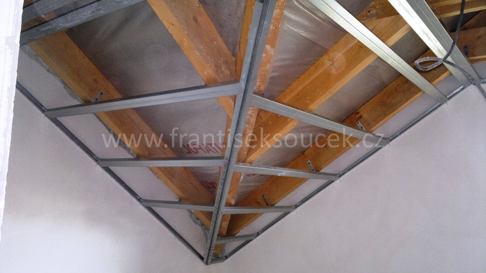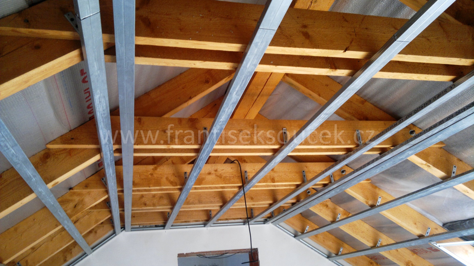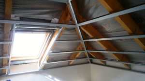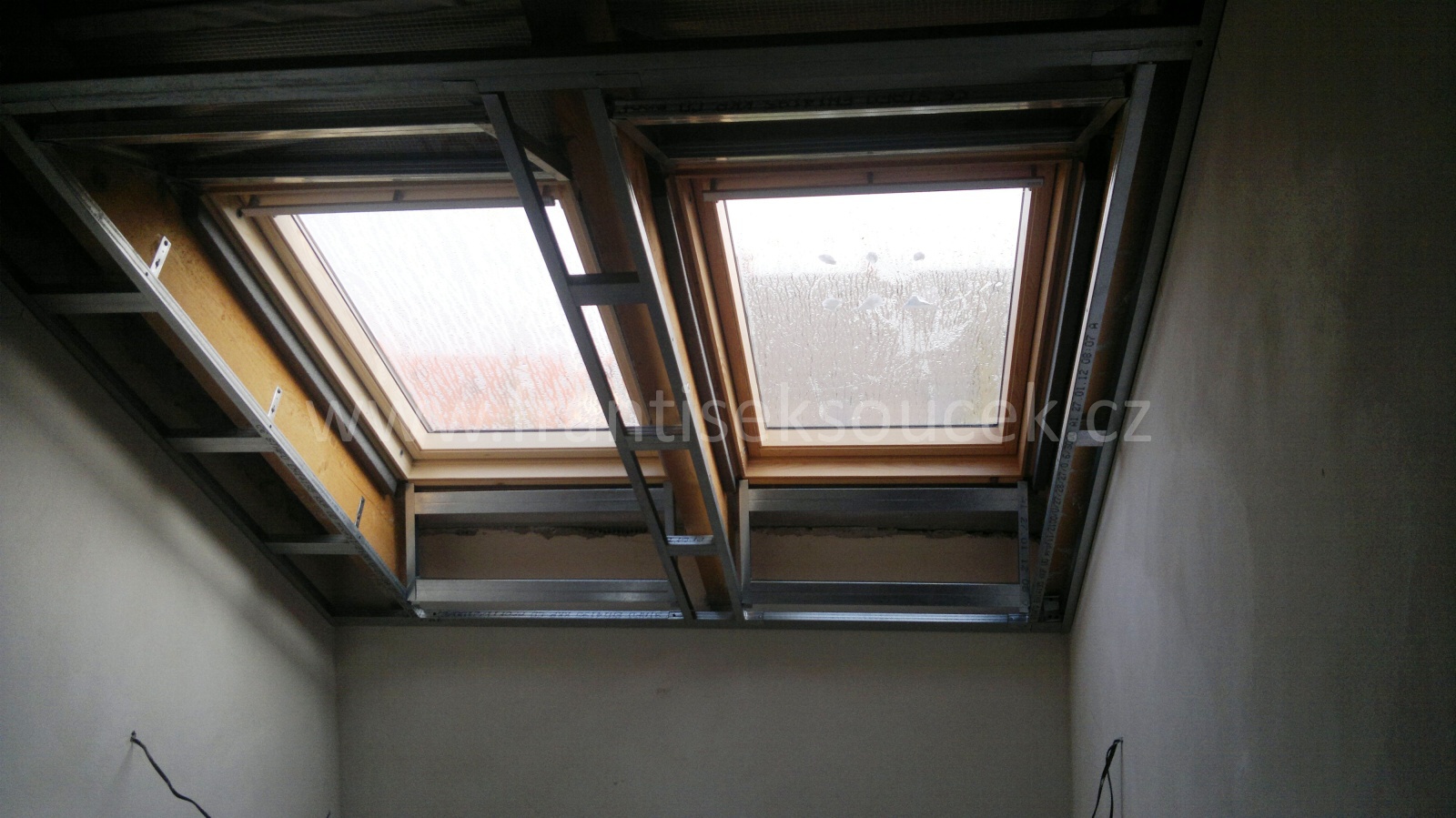 Dolní Břežany – Praha západ, montáž sádrokartonových konstrukcí Rigips, příprava pro montáž „chytré izolace, podkroví a stropní podhled 4.70.14 VK 11 jednoduché opláštění sádrokartonovou deskou RF (RFI) 12,5 mm požární odolnost REI 15 minut, 170 m2, montáž sádrokartonového opláštění okolo střešních oken Velux včetně parotěsné manžety, montáž parotěsné folie DELTA FOL REFLEX, vlez JAP Lusso ZP. |