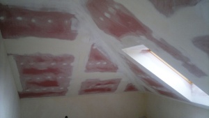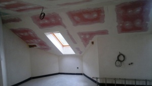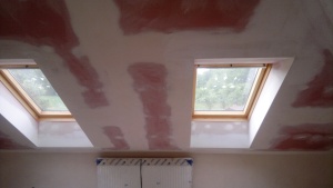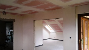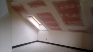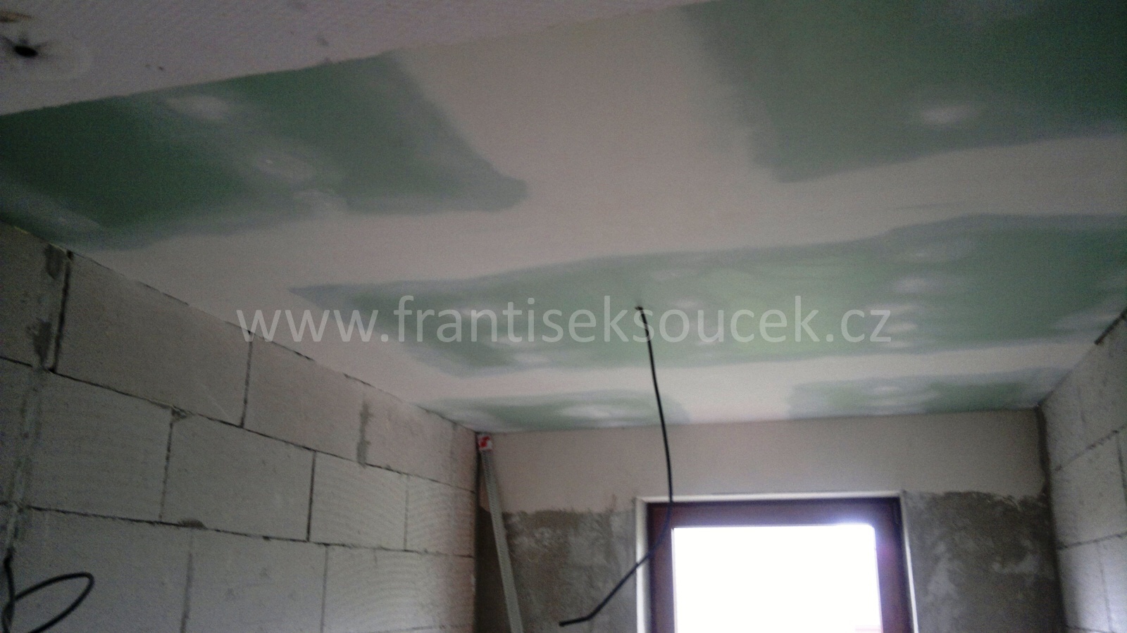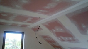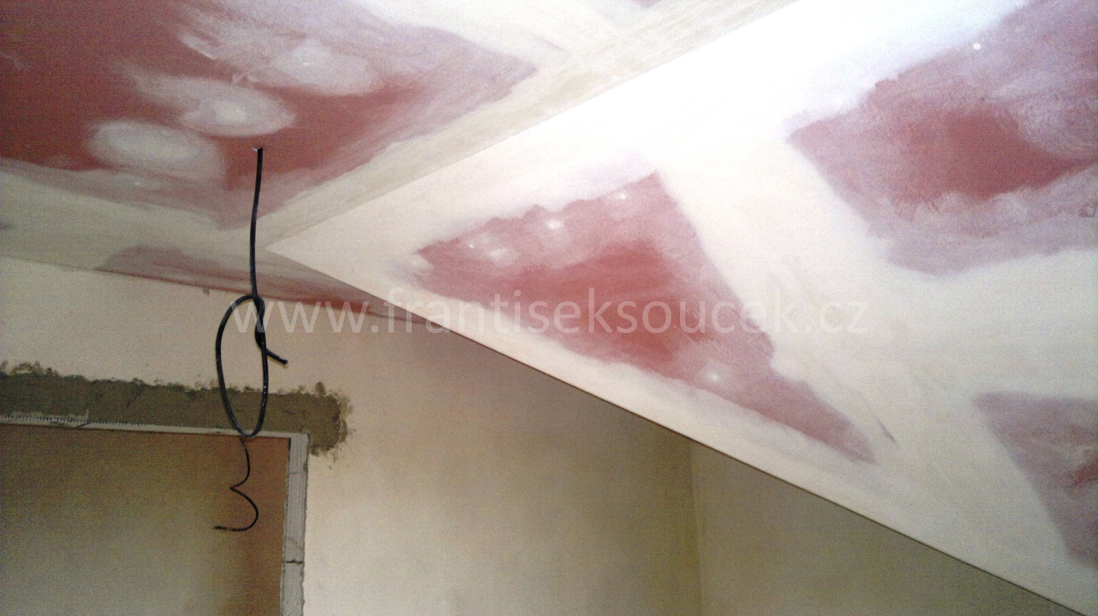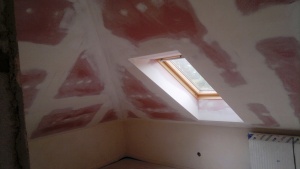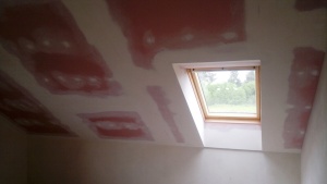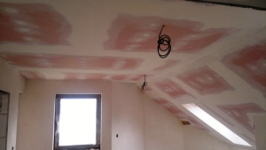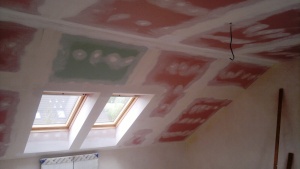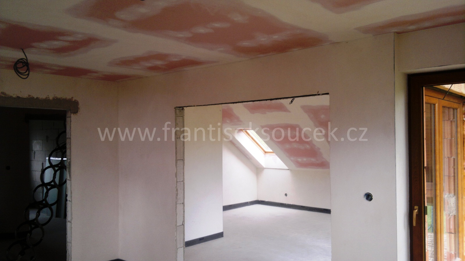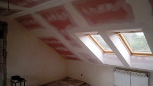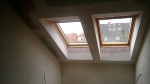 Dolní Břežany - Praha západ, montáž sádrokartonových konstrukcí Rigips, příprava pro montáž „chytré izolace, podkroví a stropní podhled 4.70.14 VK 11 jednoduché opláštění sádrokartonovou deskou RF (RFI) 12,5 mm požární odolnost REI 15 minut, 170 m2, montáž sádrokartonového opláštění okolo střešních oken Velux včetně parotěsné manžety, montáž parotěsné folie DELTA FOL REFLEX, vlez JAP Lusso ZP. |