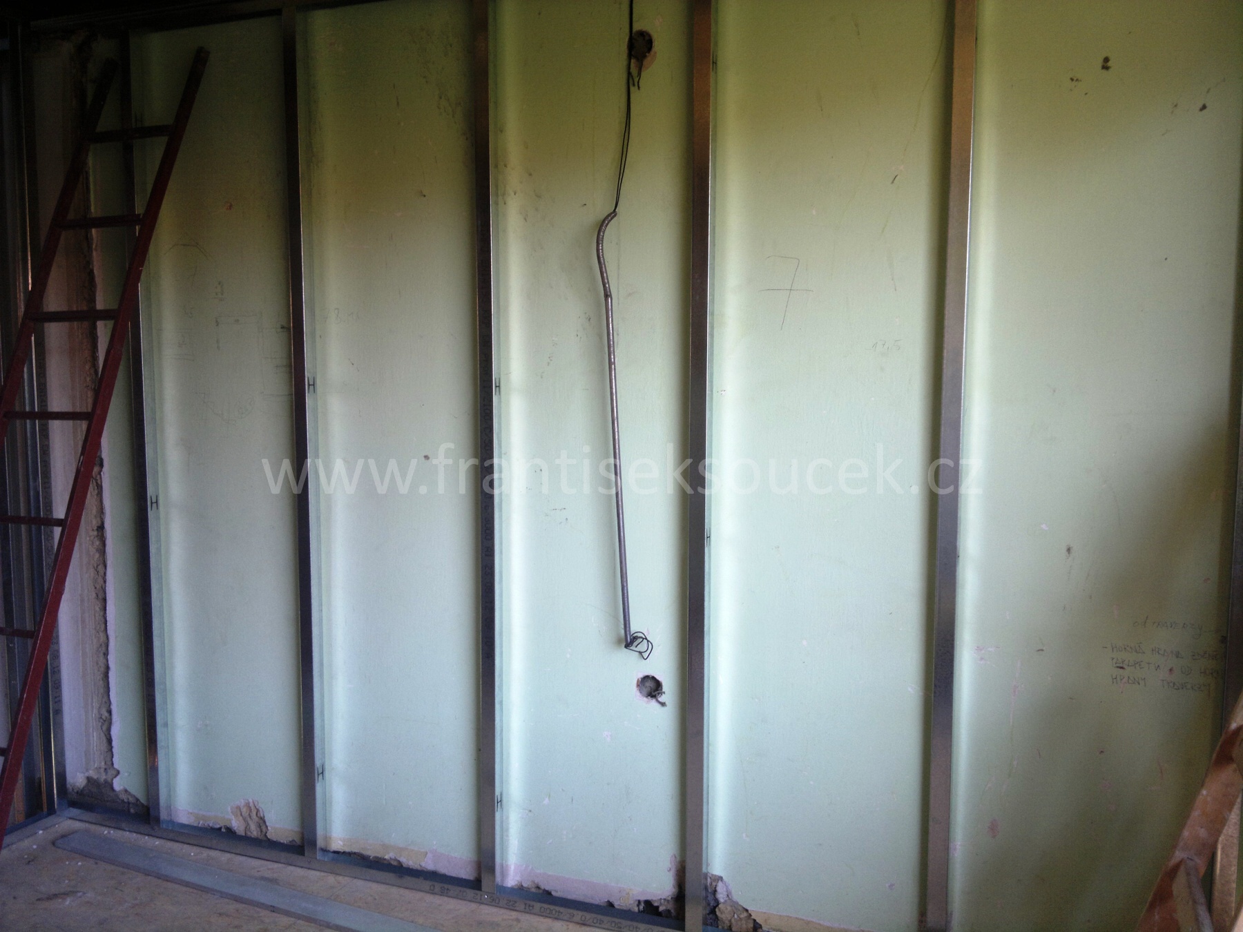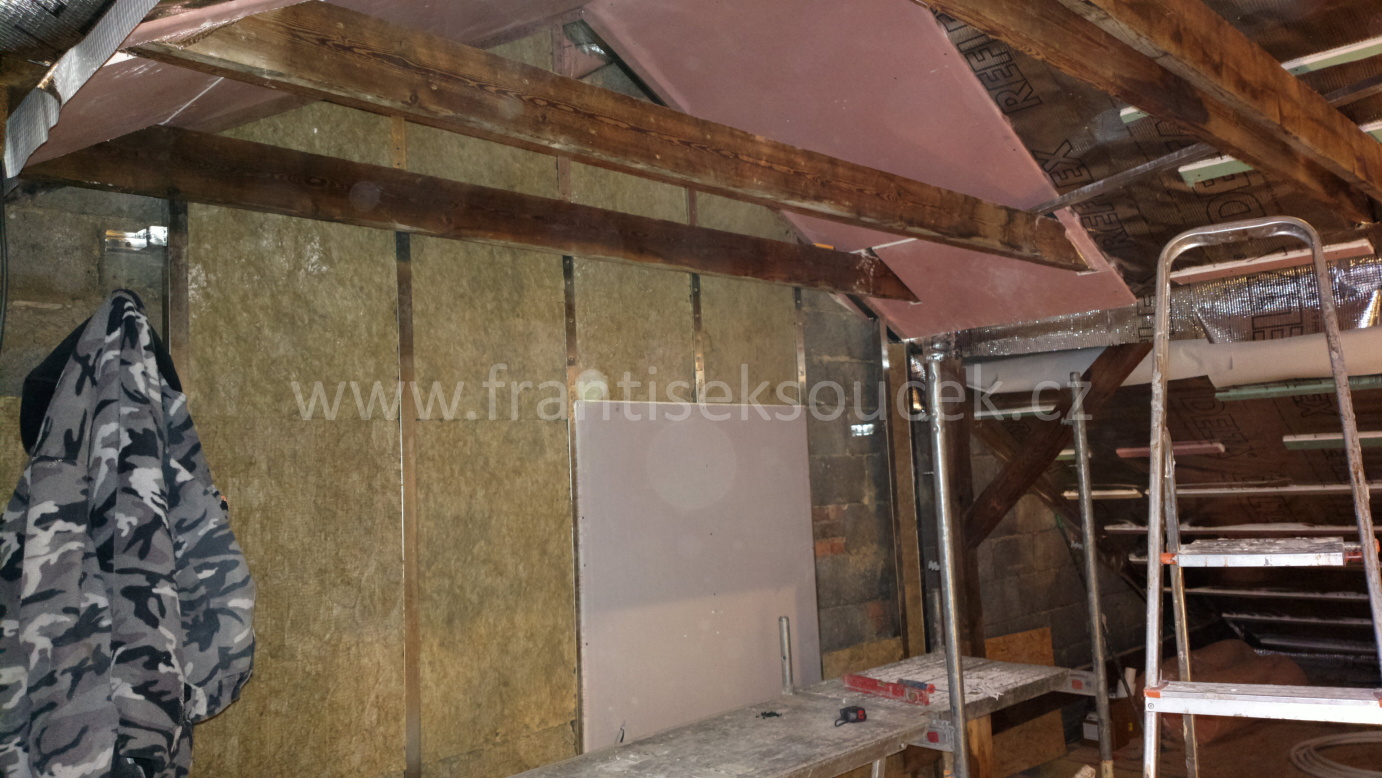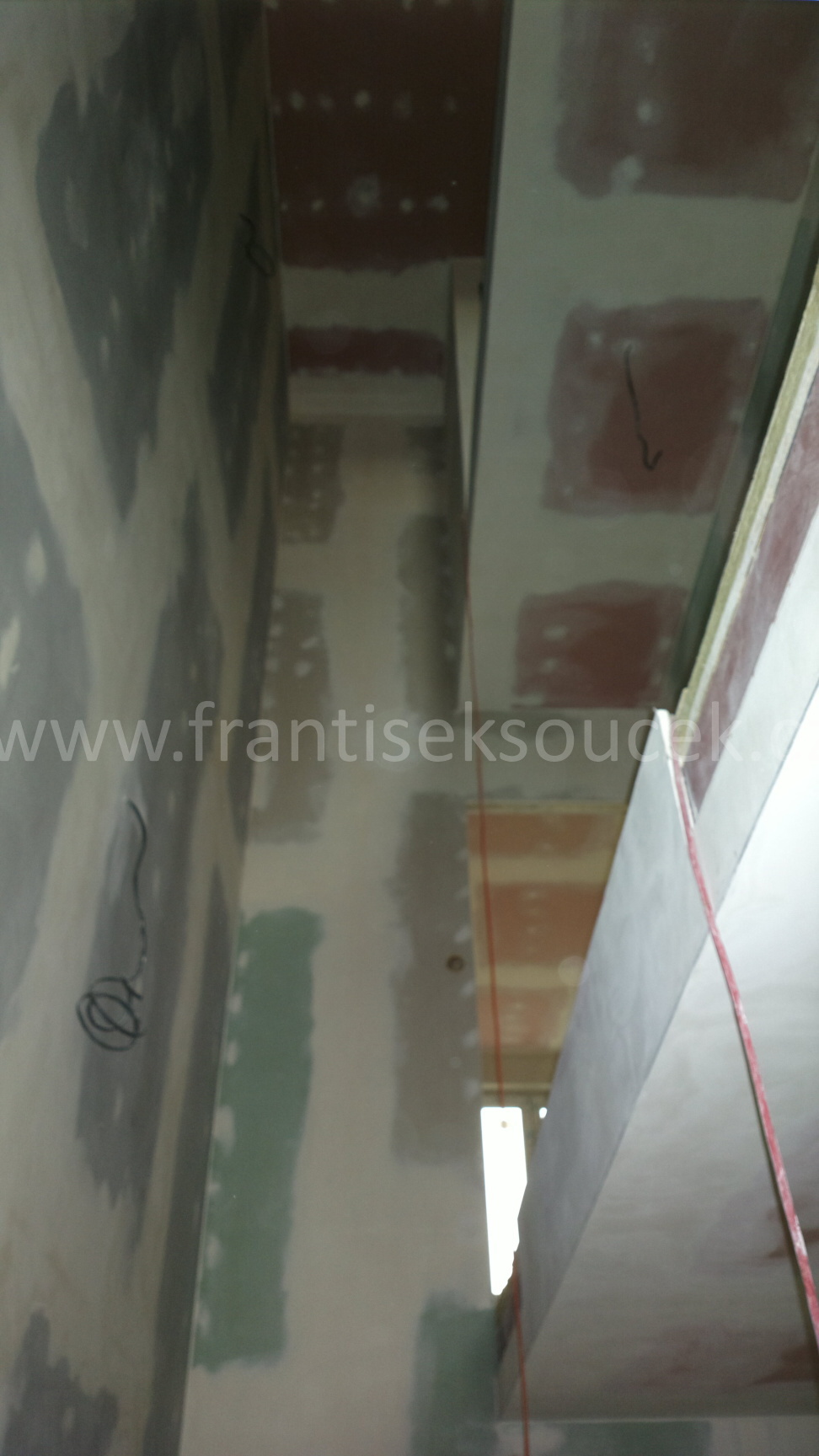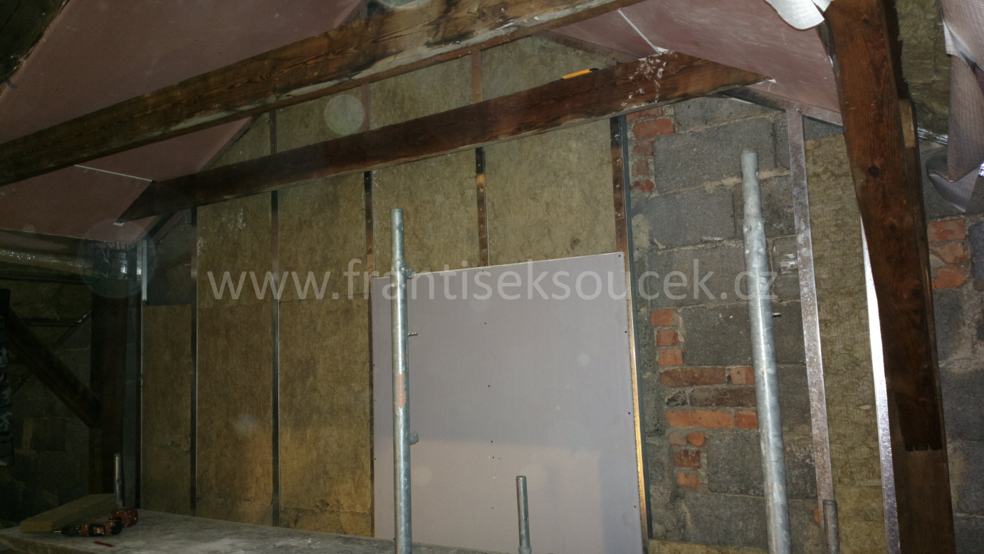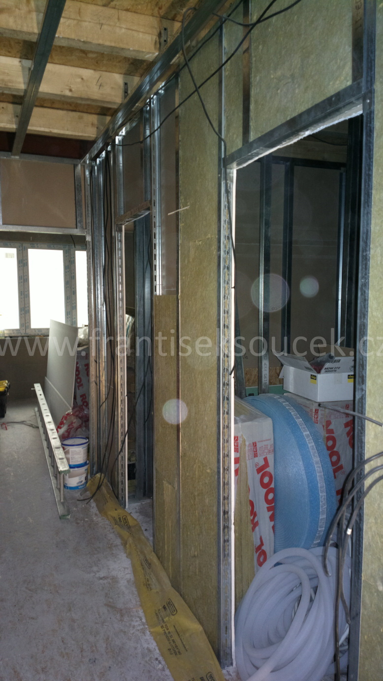 Systém suché výstavby Knauf, RD Dětská ulice, Praha 10 – Strašnice, Strop dřevěný D 152 stropní obklad z desek KNAUF RED 12,5 mm na ocelové konstrukci zavěšen na systémové závěsy REI 60 minut, W 112 sádrokartonová příčka jednoduchý rastr, dvojité opláštění, izolace Isover AKU 40 mm., sádrokartonová příčka W 115 dvojitý rastr dvojité opláštění, izolace Isover AKU 40 mm., Akustická předsazená stěna W 625 DIAMANT 12,5 mm, podkroví Knauf K 311 – 3 opláštění podkroví s kovovou nosnou konstrukcí, izolace ROCKWOOL ROKMIN 200 mm, parozábrana DELTA FOL REFLEX, parotěsná folie okolo střešních oken VELUX. |