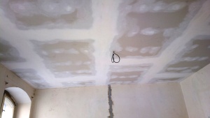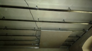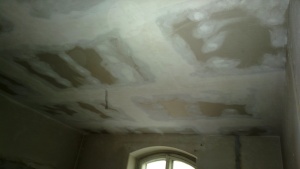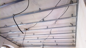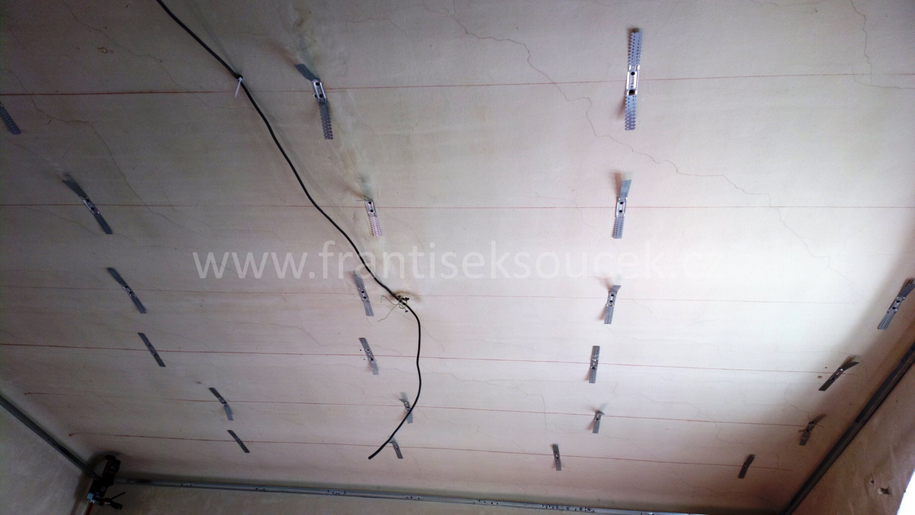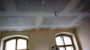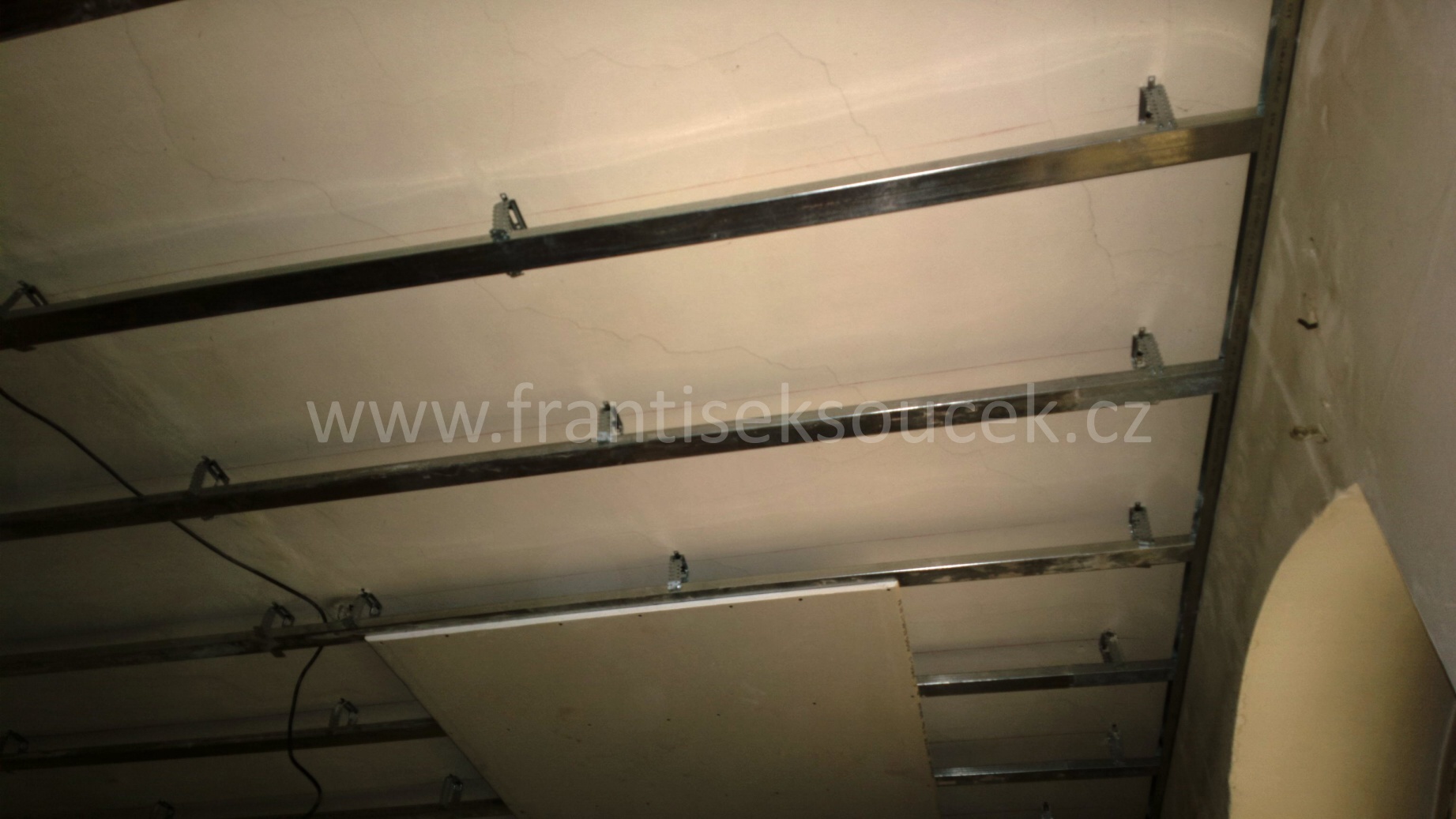 Sádrokartonový stropní podhled Knauf D112, Praha 1, ulice Rybná, přímá montáž sádrokartonová konstrukce na podbití rákosového stropu 56 m2, doba realizace 3 dny.