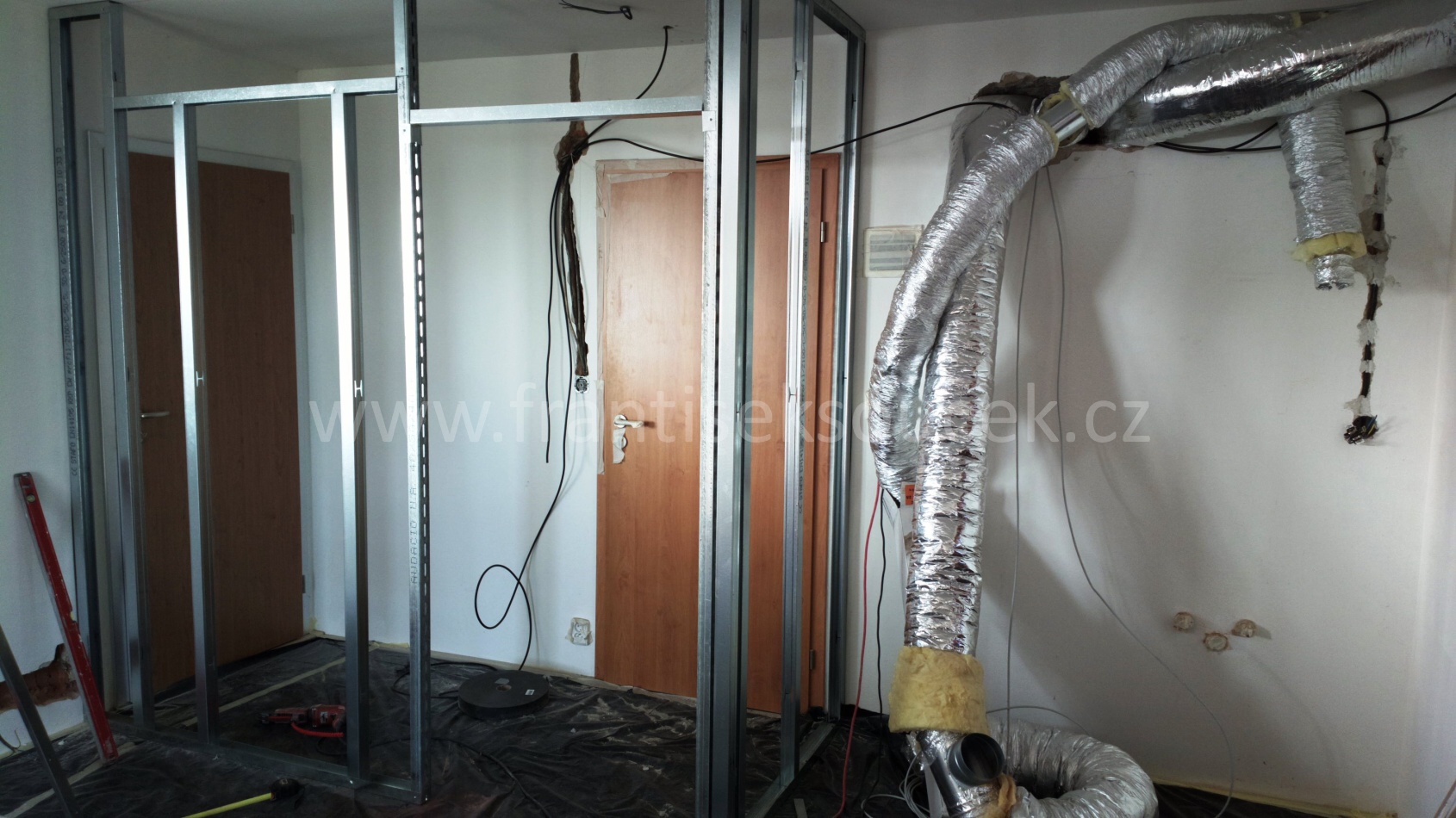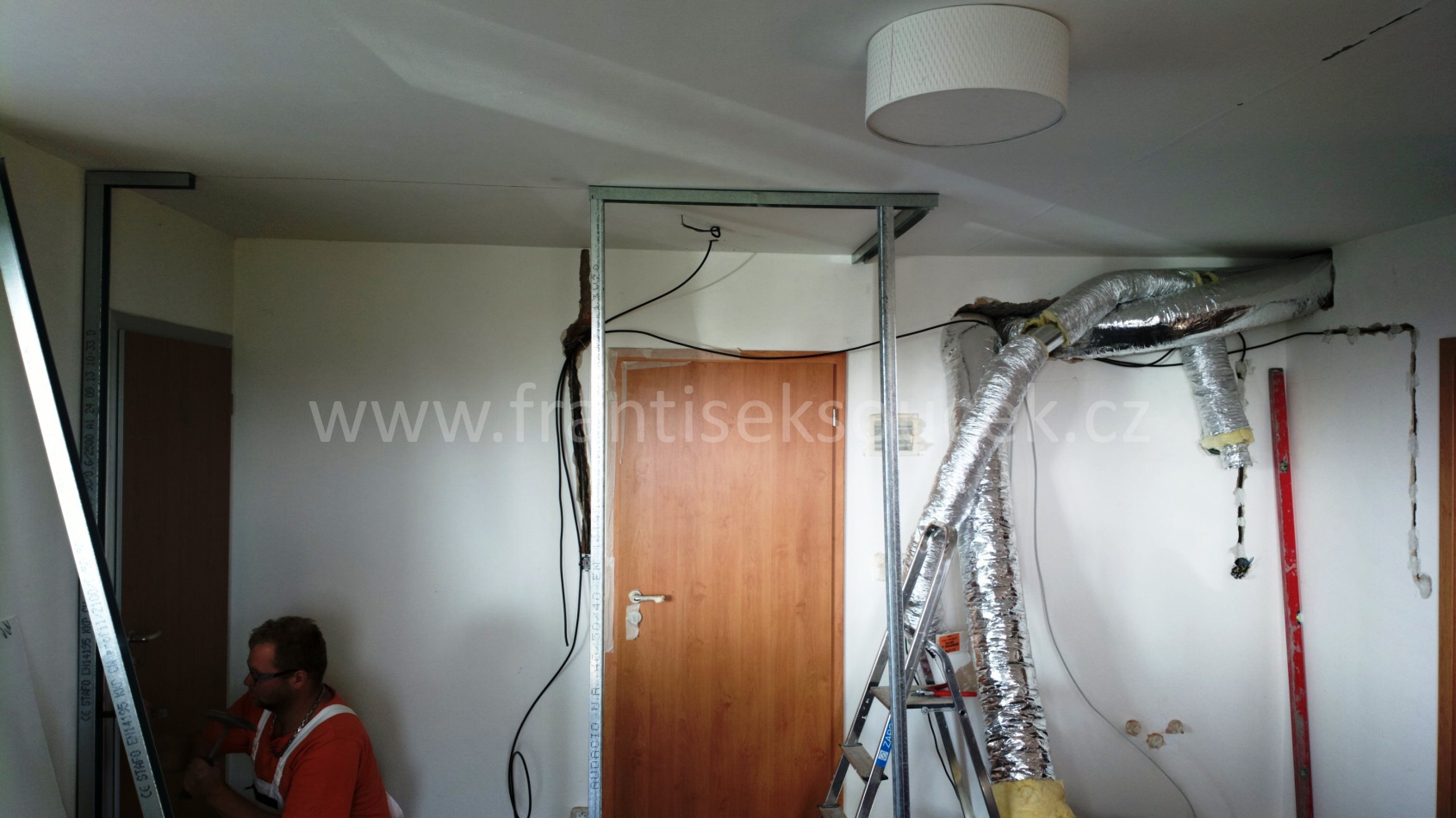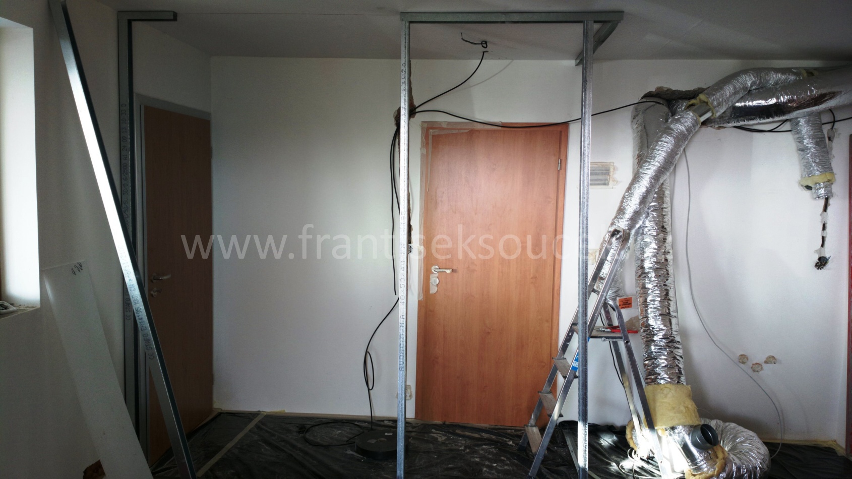 Konstrukce ze sádrokartonu, Praha 5 - Slivenec, zakrytí rozvodů VZT sádrokartonovými kastlíky a opláštěny sádrokartonovou deskou RB 12,5 mm, stropní konstrukce na CD a ud profilech, montáž výustek. Dělící příčka W112, ze sádrokartonových profilů UW 50 a CW 50, příprava dveřního otvoru pro montáž obložkových dveří z profilů UA, vložení izolace MPE 40mm do kovového rastru pro zlepšení zvukových vlastností, vytvoření prosvícení z plexiskla, kvalita provedení Q3, doba realizace 2 dny. |