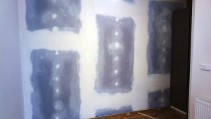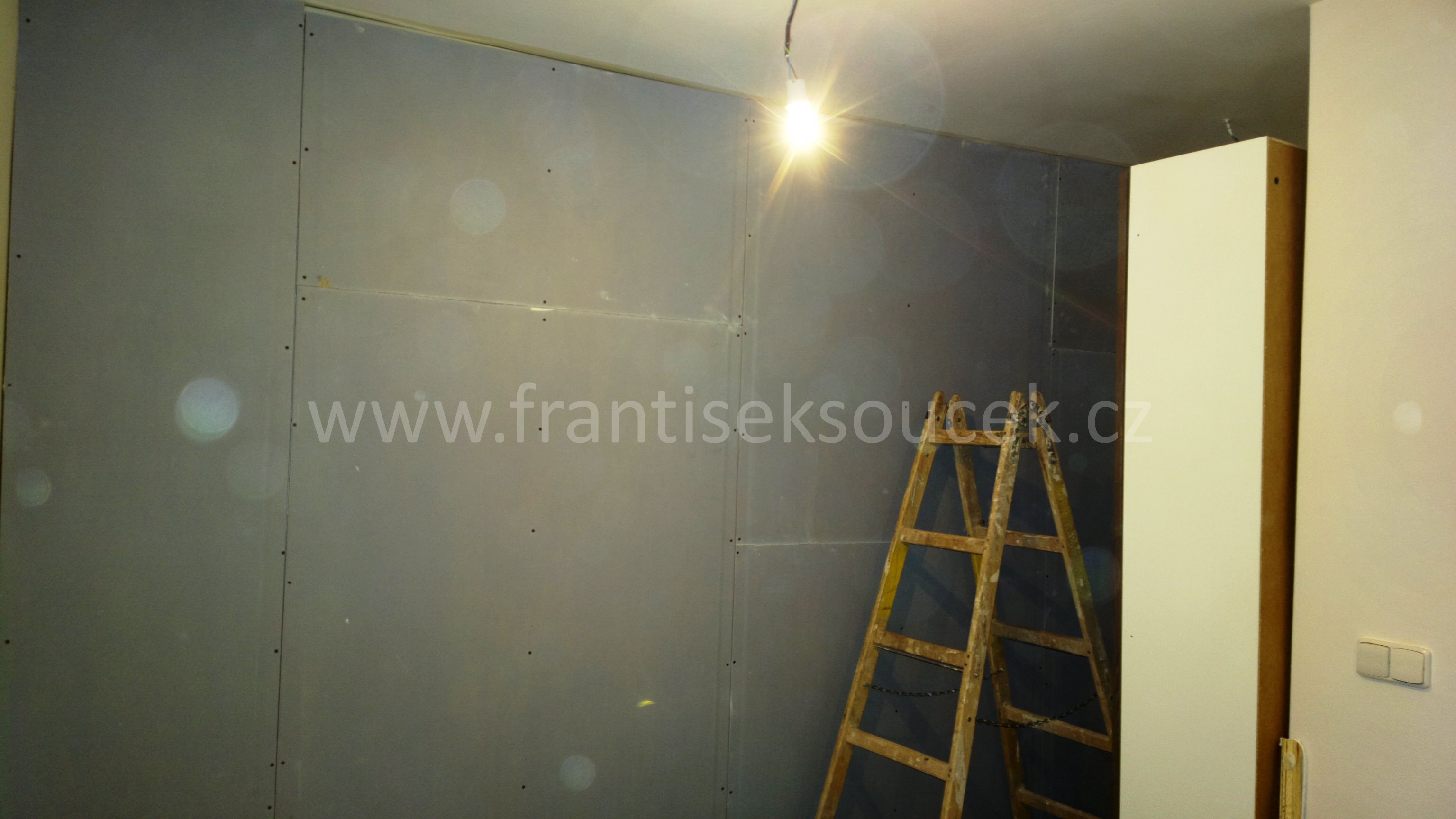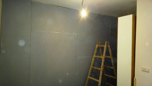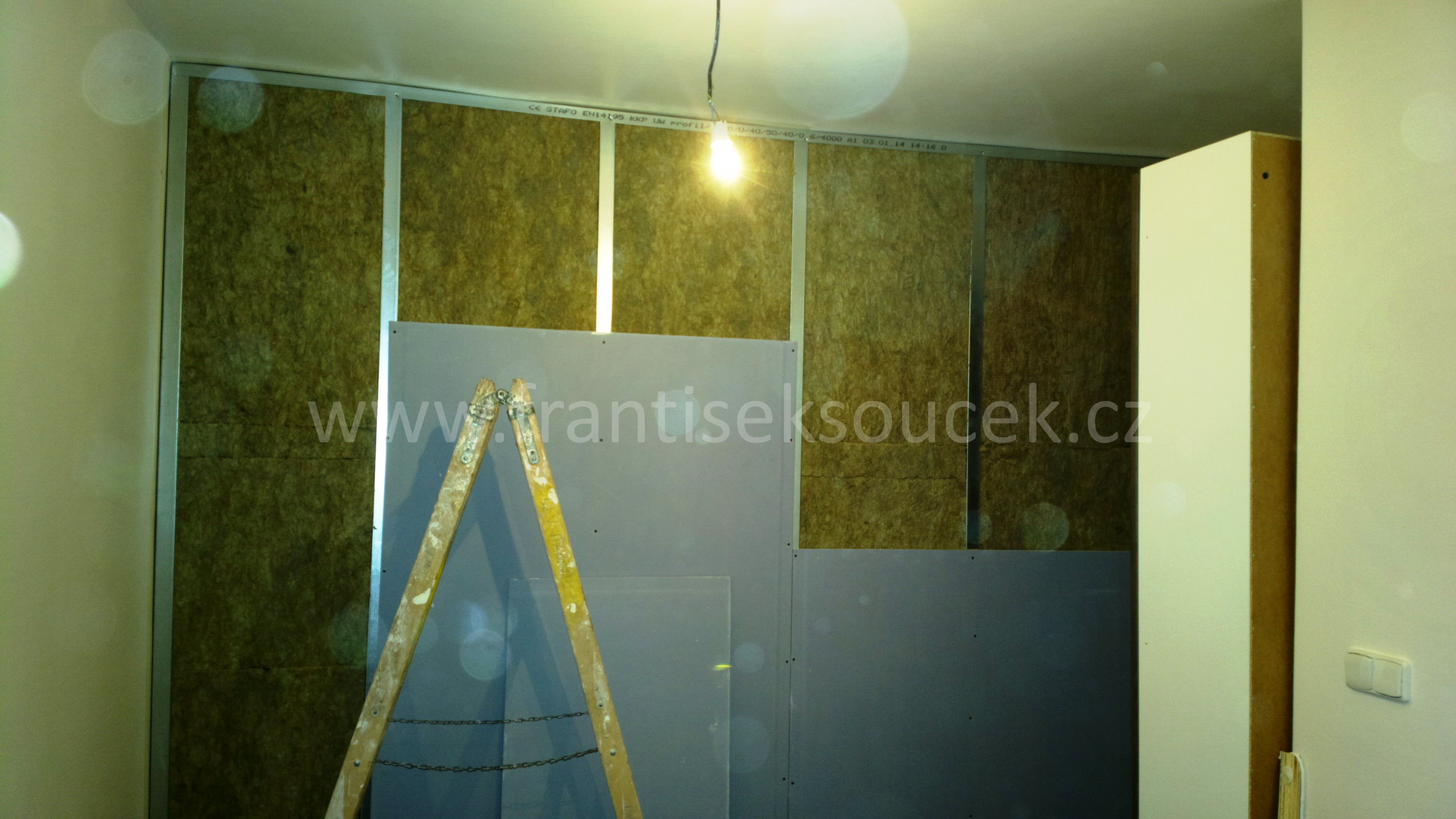Montáž modré desky Rigips, Praha 4 - Nusle, protihluková ochrana staveb modrý akustický systém systém Rigips, dodání a montáž sádrokartonové akustické předsazené stěny volně stojící, opláštěného 2x sádrokartonovou modrou deskou Rigips MA 12,5 mm v podlažním domě z důvodu hlučného výtahu, zlepšení zvukové neprůzvučnost až o Rw 28 db, požární odolnost RE 30 minut, 11 m2, 1 1/4 dne montáž. |