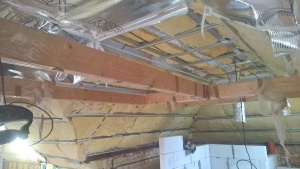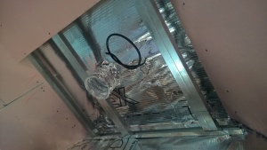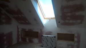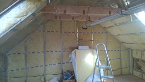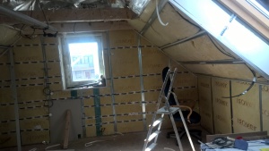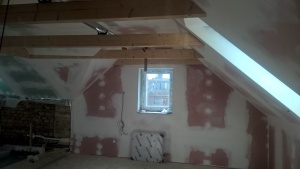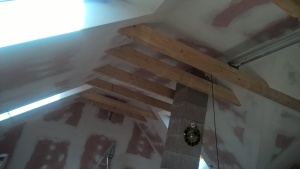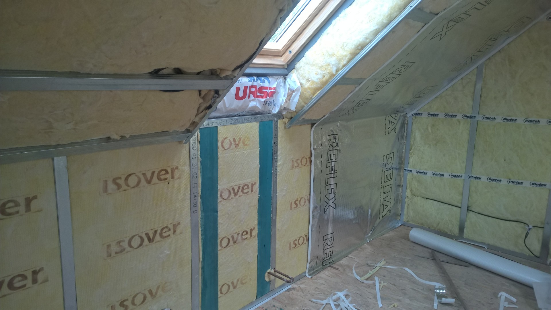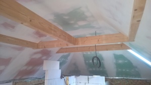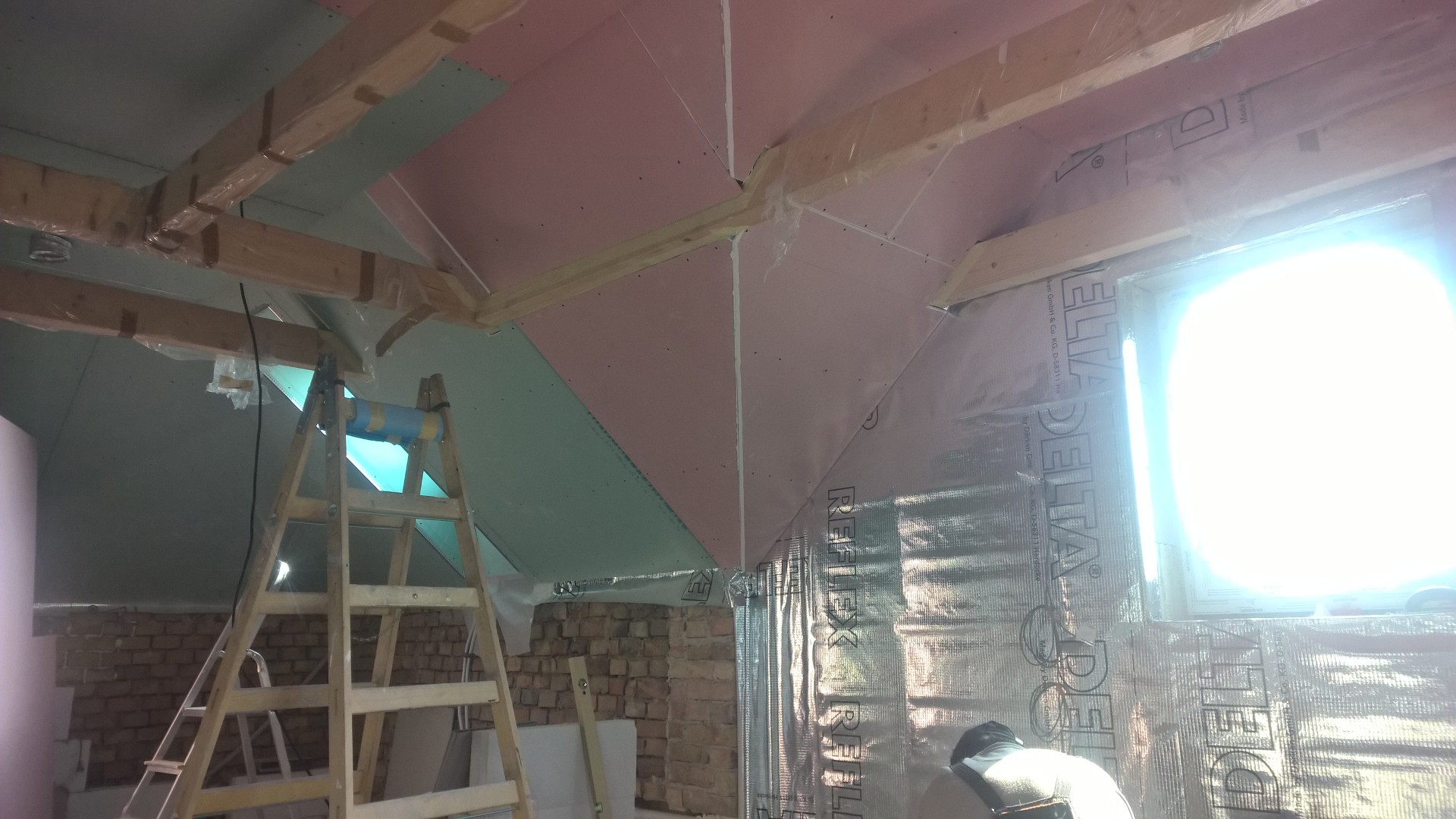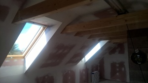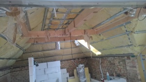 Sádrokartonové podkroví K 311 Knauf REI 15 minut Sadská - střední Čechy, zhotovení sádrokartonového podkroví s viditelnými trámy opláštěno sádrokartonovou deskou Knauf RED 12,5 mm, parozábrana DÖRKEN Delta Reflex, opláštění střešních oken Manžeta z parotěsné fólie Velux, předsazená stěna W 626 opláštěno sádrokartonovou deskou Knauf RED 2 x 12,5 mm REI 30 minut |