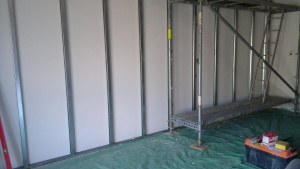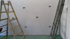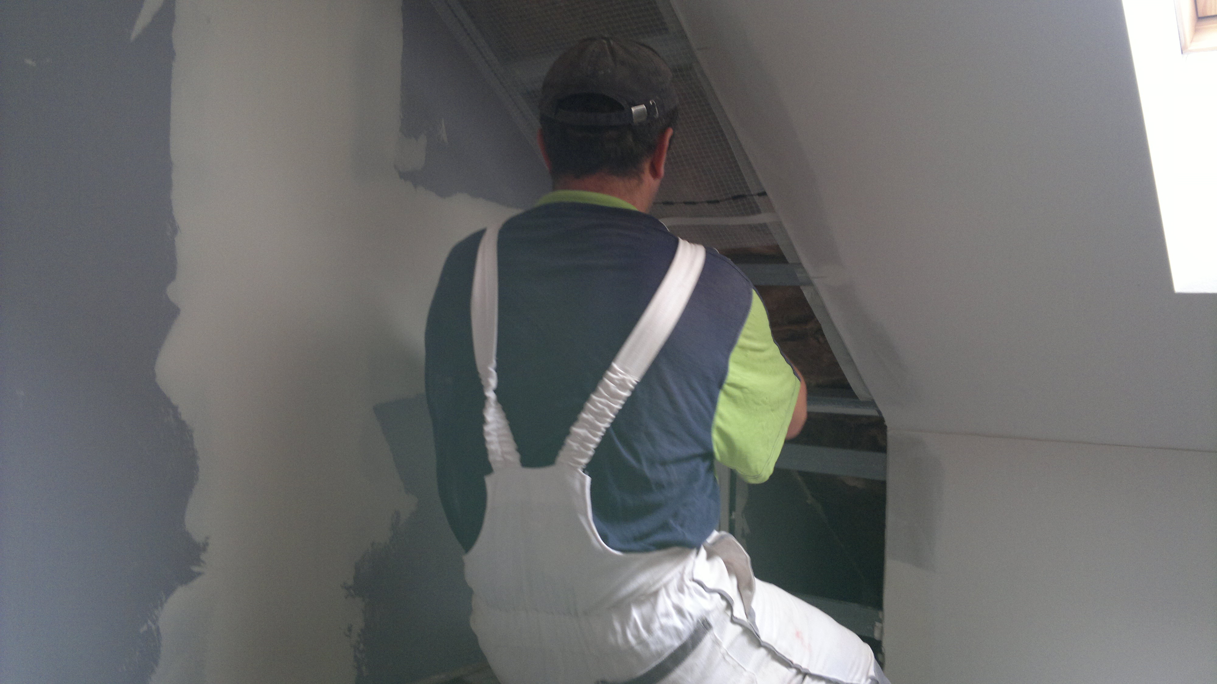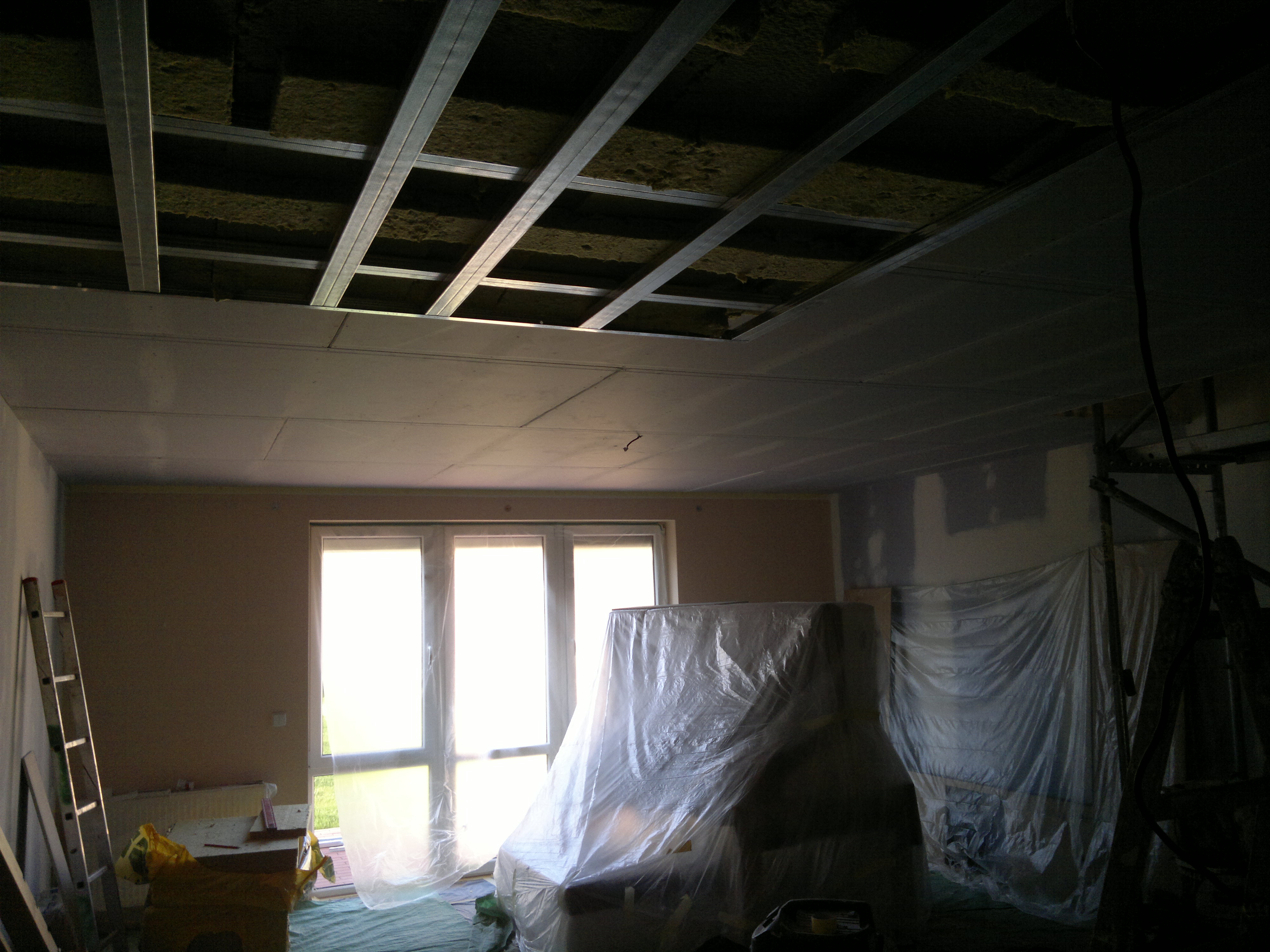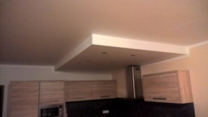 Suchá výstavba - akustický sádrokarton Modré ticho II a III etapa Rodinný dům Říčany, akustická předsazená stěna Rigips - úprava nedostatečné akustiky obvodové stěny řádového rodinného domu, rozebrání podkroví, vložení dodatečné izolace do stropní dutiny, úprava elektroinstalace předsazená stěna volně stojící akustická na CW a UW profilech 100 mm, vložená minerální izolace MPE 80 mm, zlepšení zvukové neprůzvučnosti až Rw o 28 dB., akustický podhled Rigips strop D112 zvuková neprozvučnost Rw 60db REI 30 minut, sádrokartonový ostrůvek v kuchyni, montáž a dodání LED bodového osvětlení Kanlux, výmalba |