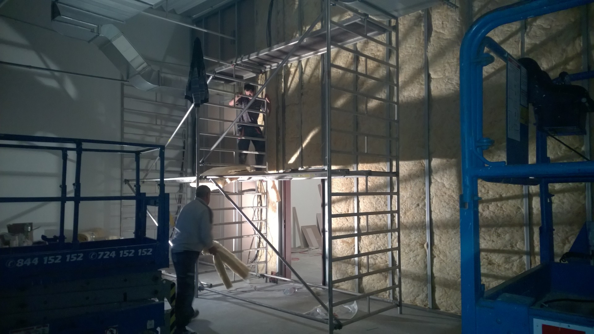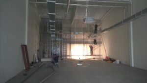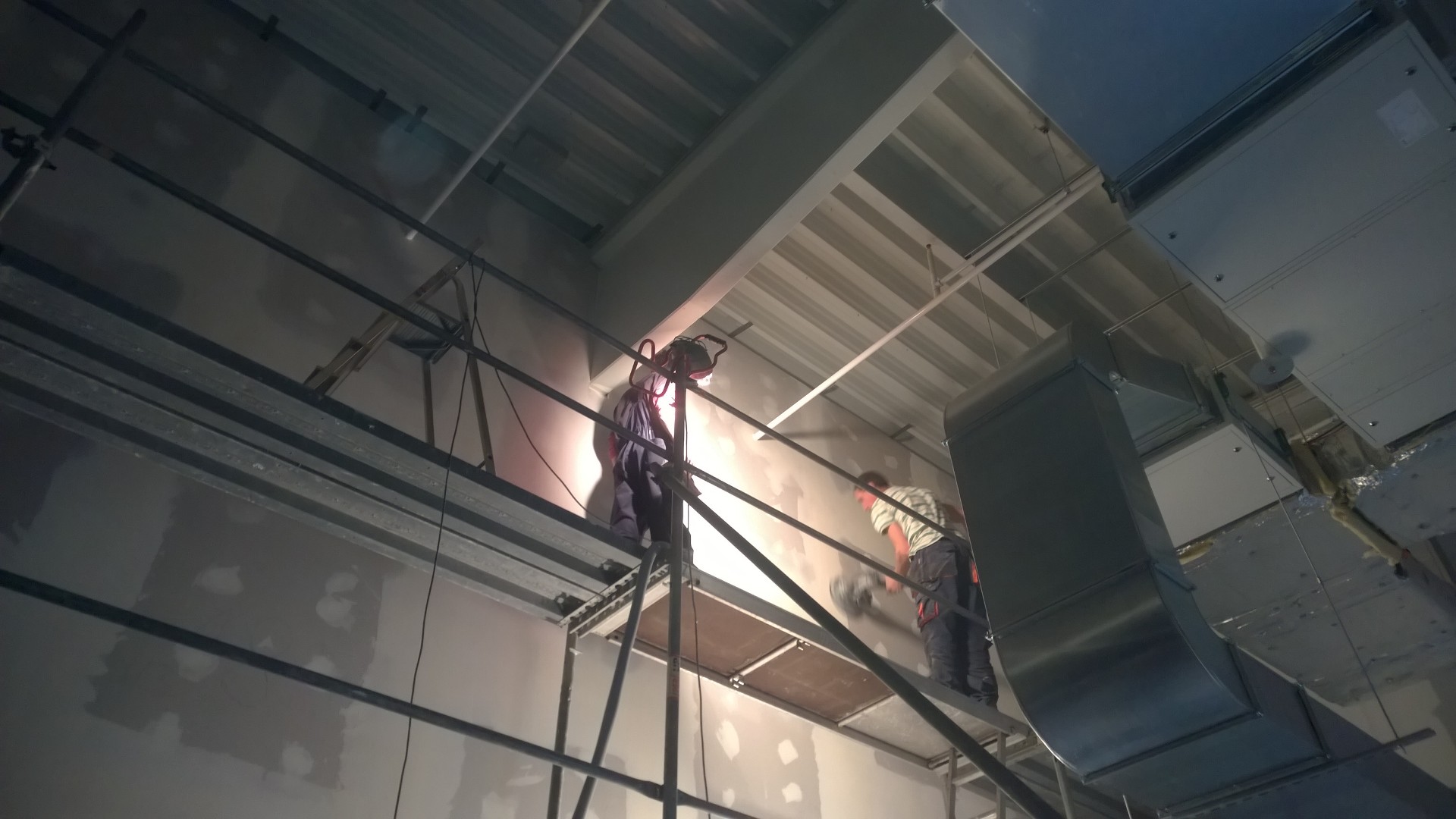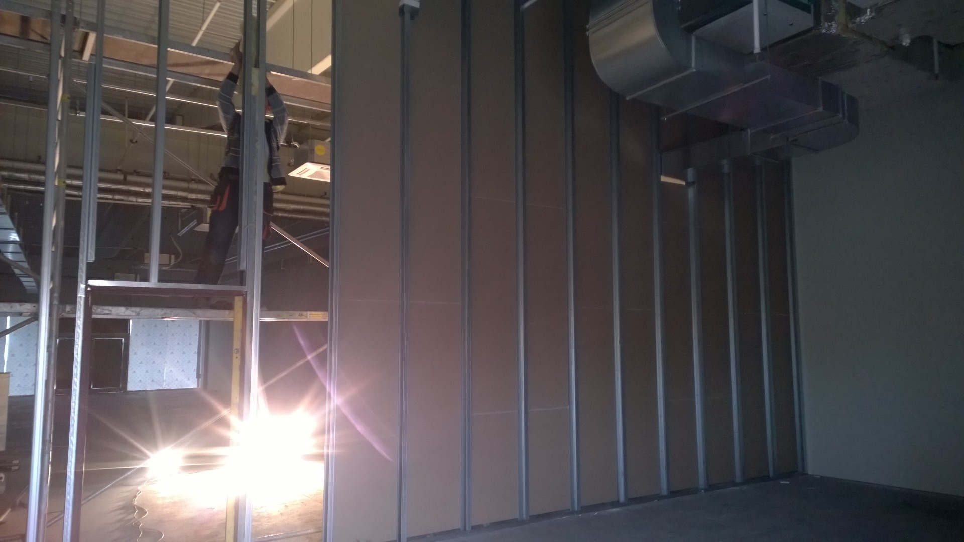 Suchá výstavba – FAOC, zhotovení sádrokartonových vysokých příček W112 opláštěné 2x sádrokartonovou deskou Knauf White 12,5 mm, příčka ze sádrokartonu vysoká 7,5 a 6,5 metru včetně kluzkého napojení k stropní konstrukci, profil UV MAX, pokládka dlažky, provedení kabeláže ve stávajících protipožárních příčkách ze sádrokartonu dle technologie Knauf, oprava diletací v oplaštění Protipožární akrylový tmel Hilti, CFS-S ACR, drážkování drážkovacím strojem Hilti DC-SE 20, vystěrkování vysprávkovou hmotou WEBER a olištování čisticí zóny, seštelování dveří.