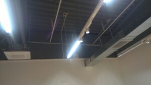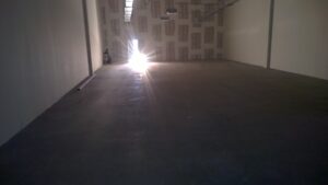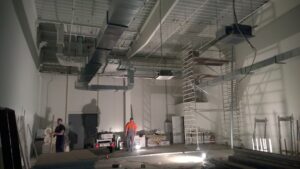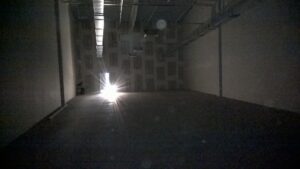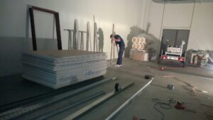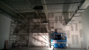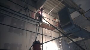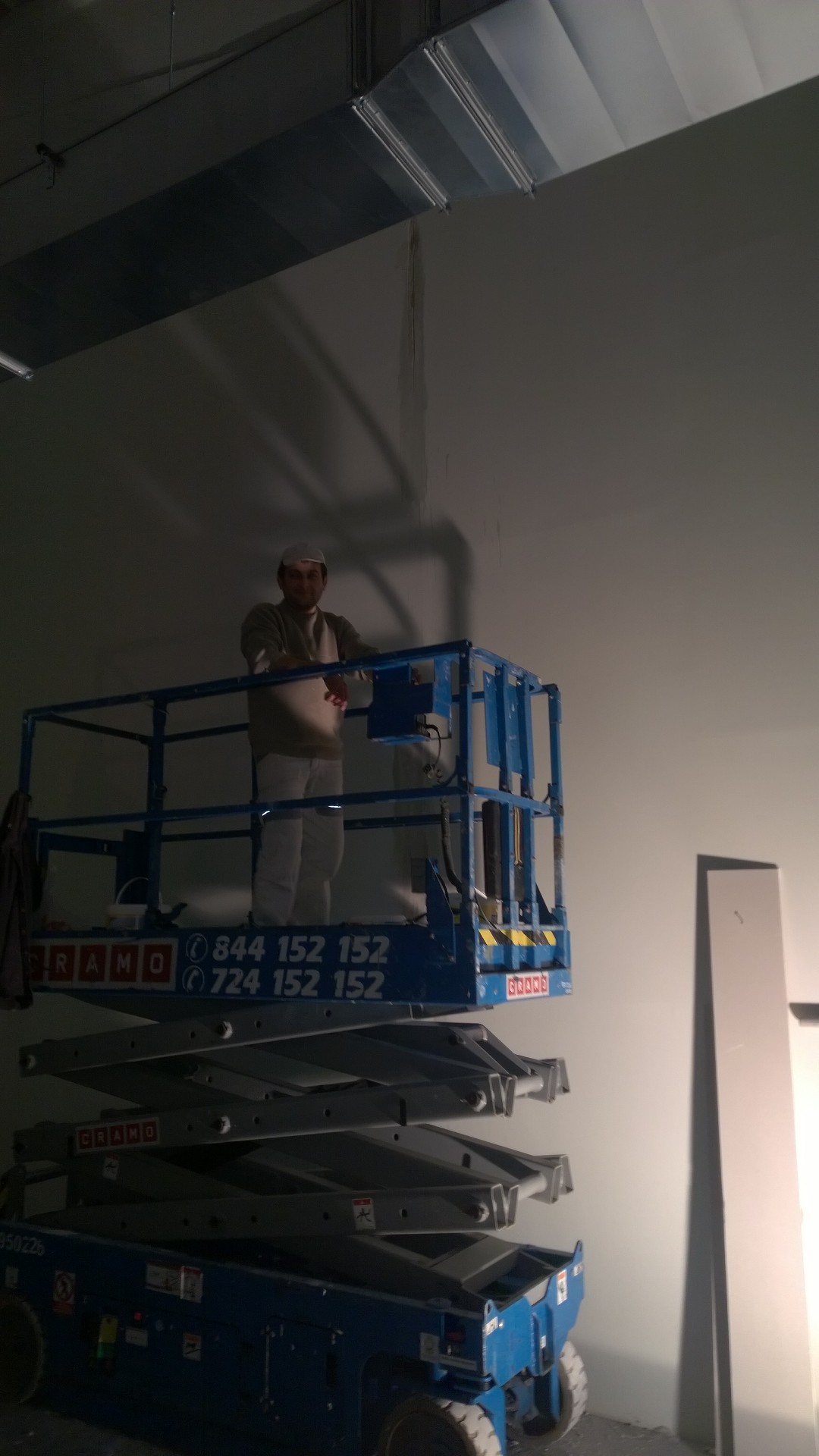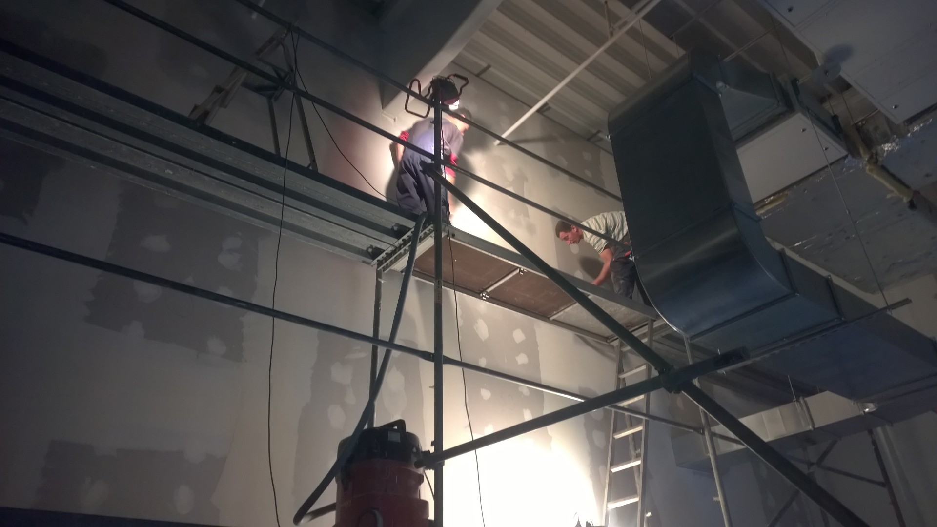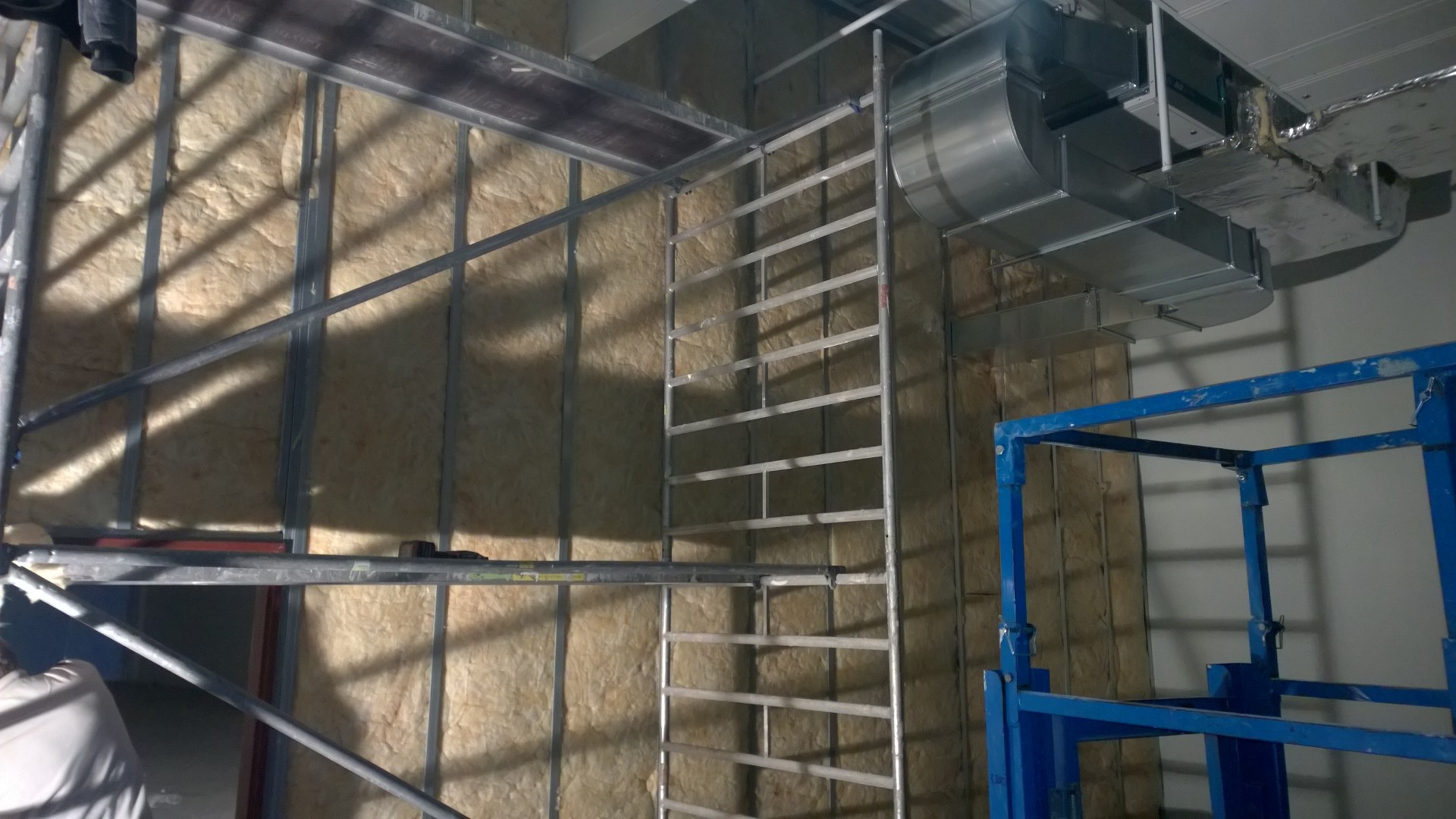 Suchá výstavba – FAOC, zhotovení sádrokartonových vysokých příček W112 opláštěné 2x sádrokartonovou deskou Knauf White 12,5 mm, příčka ze sádrokartonu vysoká 7,5 a 6,5 metru včetně kluzkého napojení k stropní konstrukci, profil UV MAX, pokládka dlažky, provedení kabeláže ve stávajících protipožárních příčkách ze sádrokartonu dle technologie Knauf, oprava diletací v oplaštění Protipožární akrylový tmel Hilti, CFS-S ACR, drážkování drážkovacím strojem Hilti DC-SE 20, vystěrkování vysprávkovou hmotou WEBER a olištování čisticí zóny, seštelování dveří.