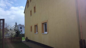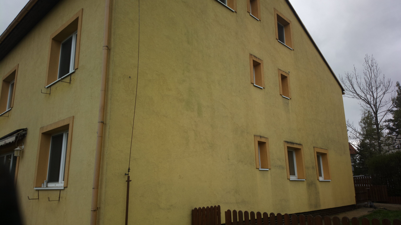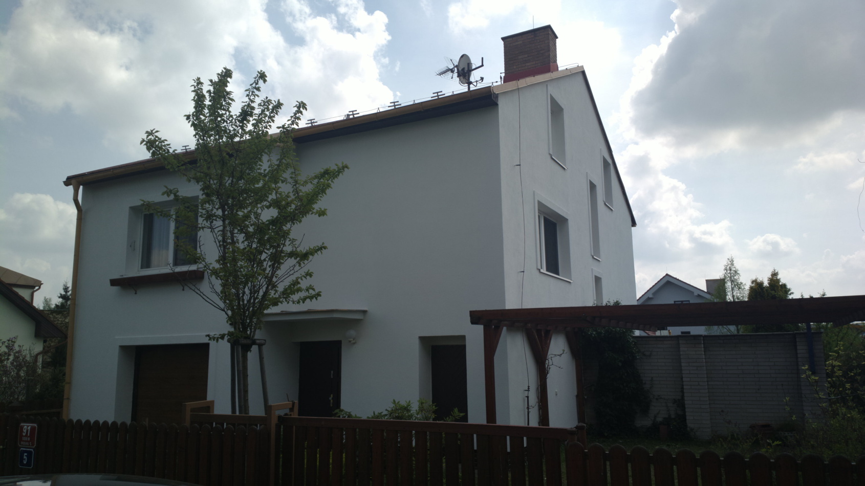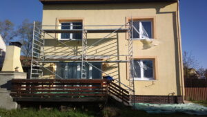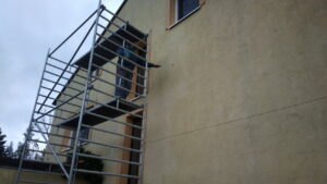 Fasáda Praha 5 – Sobín, nátěr a napuštění fasády odstraňovačem řas, mechů a lišejníků – W003. Biologický roztok k čištění a ochraně proti řasám, plísňovým houbám, mechům a lišejníkům. Omytí fasády tlakovou vodou, Weber.ton bio – protiplísňový fasádní nátěr bílý, stavba a bourání lešení.