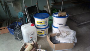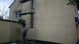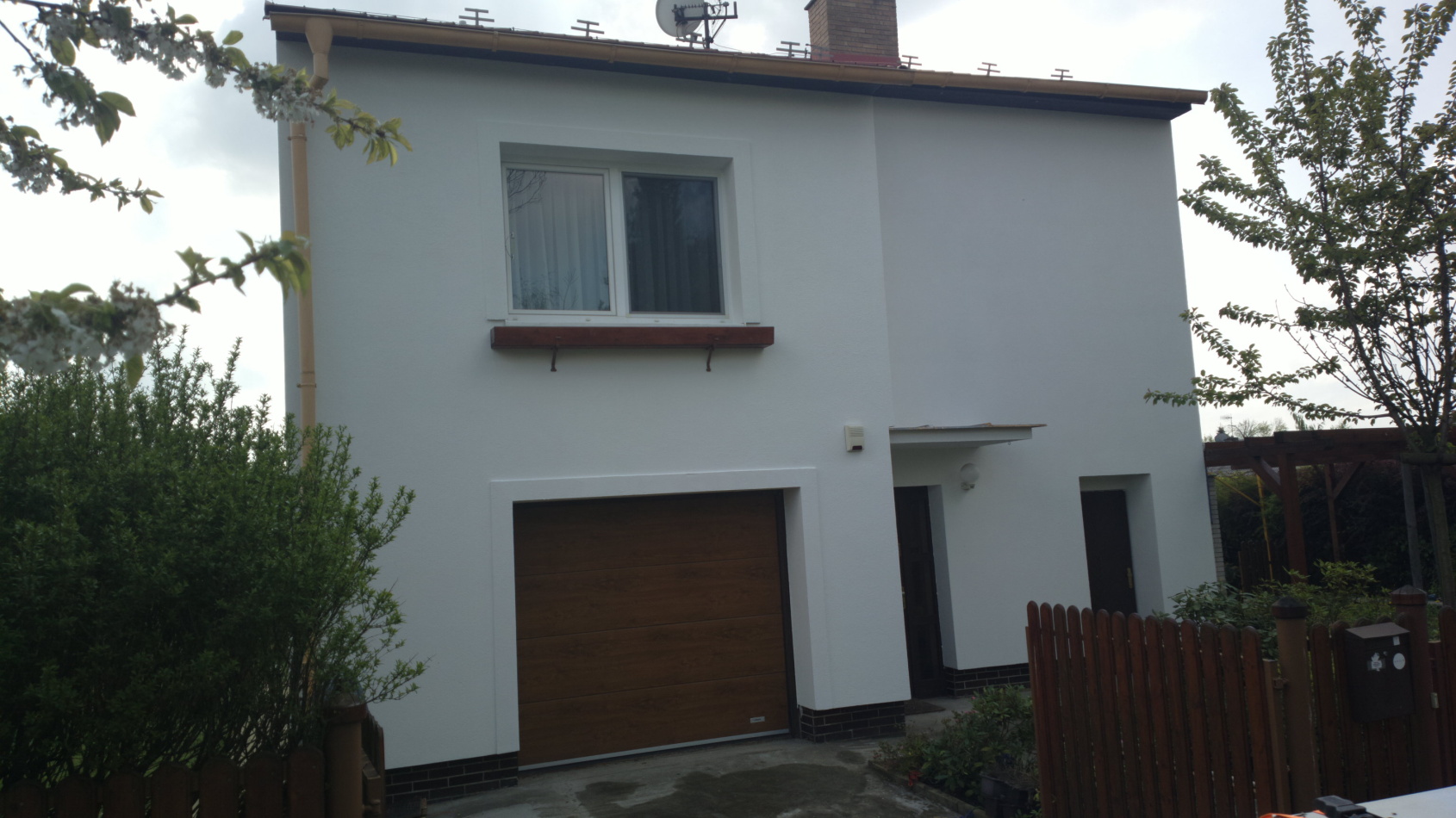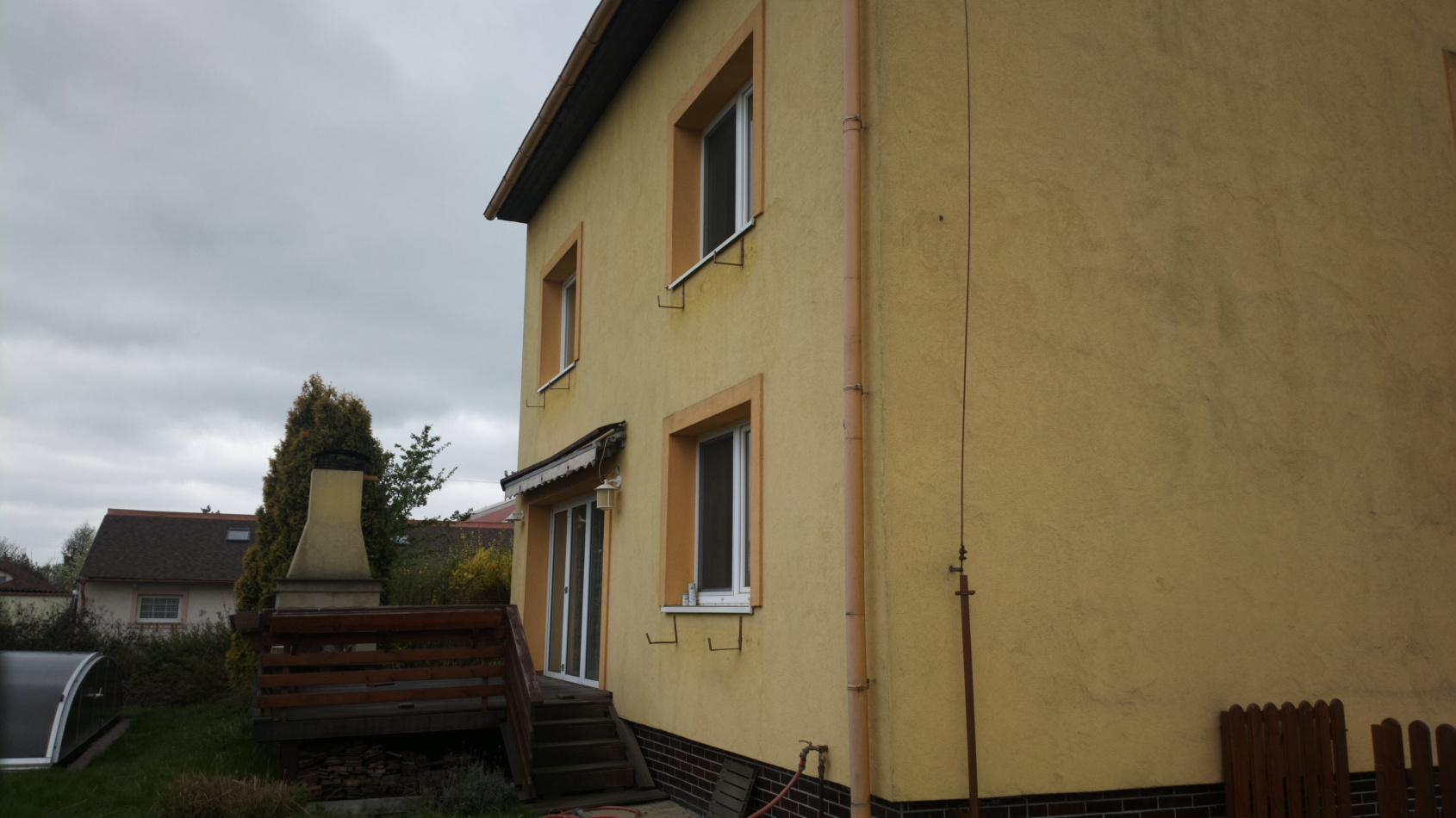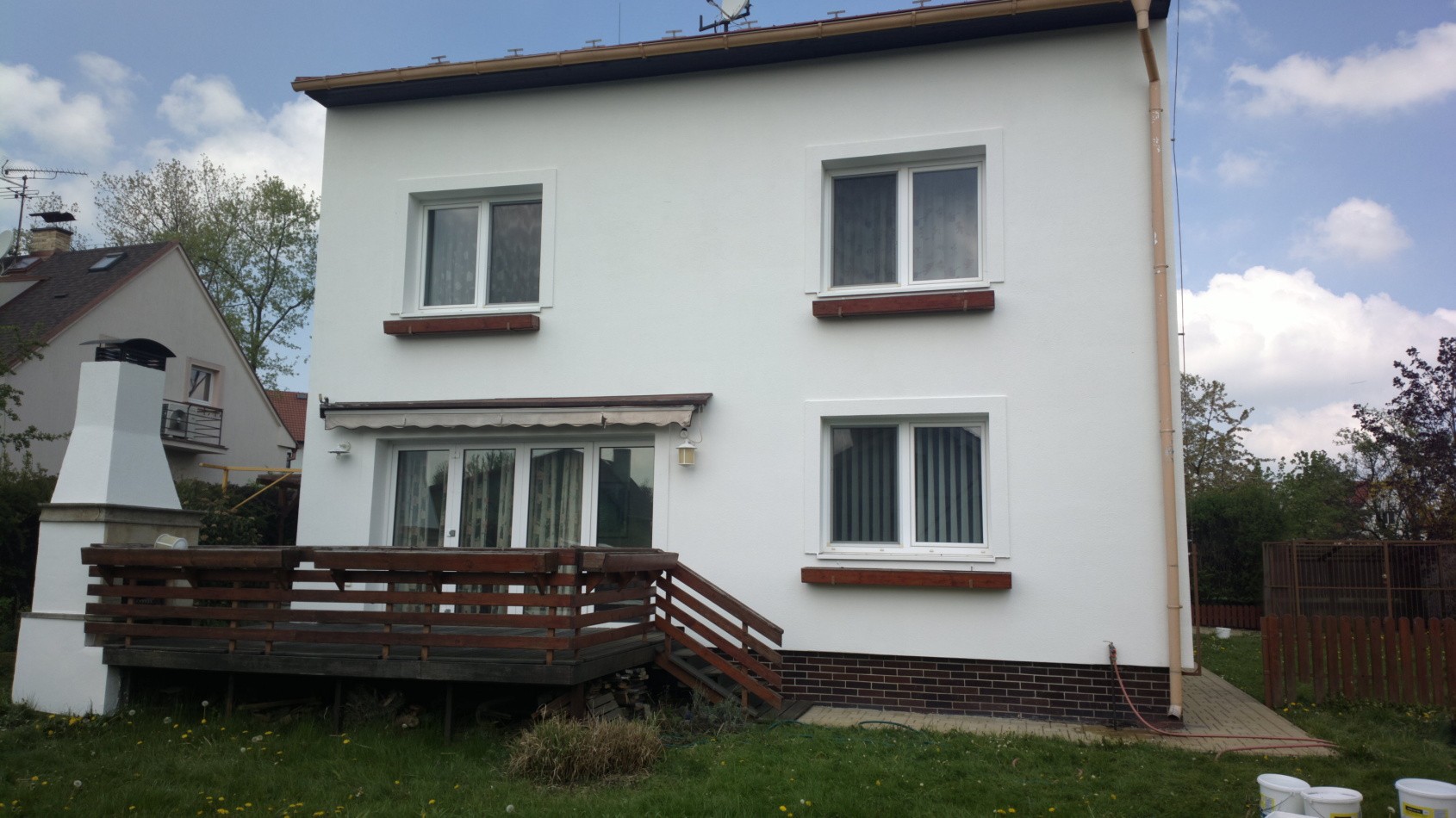 Fasáda Praha 5 – Sobín, nátěr a napuštění fasády odstraňovačem řas, mechů a lišejníků – W003. Biologický roztok k čištění a ochraně proti řasám, plísňovým houbám, mechům a lišejníkům. Omytí fasády tlakovou vodou, Weber.ton bio – protiplísňový fasádní nátěr bílý, stavba a bourání lešení.