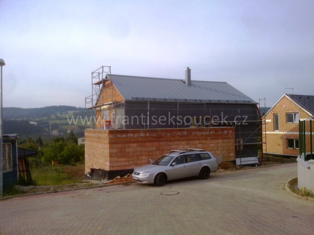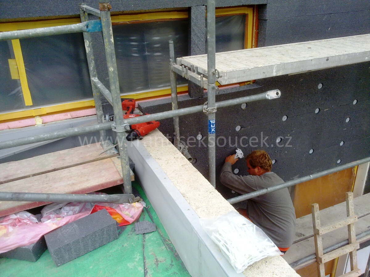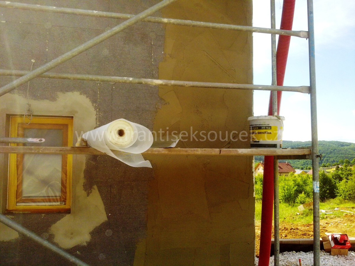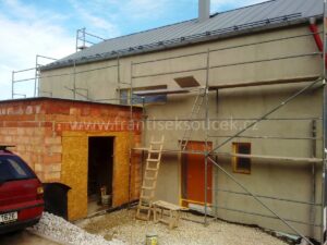 Zateplení fasády rodinný dům Loděnice, okres Beroun – střední Čechy. Fasádní polystyren 120 mm. Bachl Extrapor, zakládací lišta, talířové hmoždinky, polystyrénová zátka, silikonová omítka Weber 1,5 mm (točená) 220 m2.