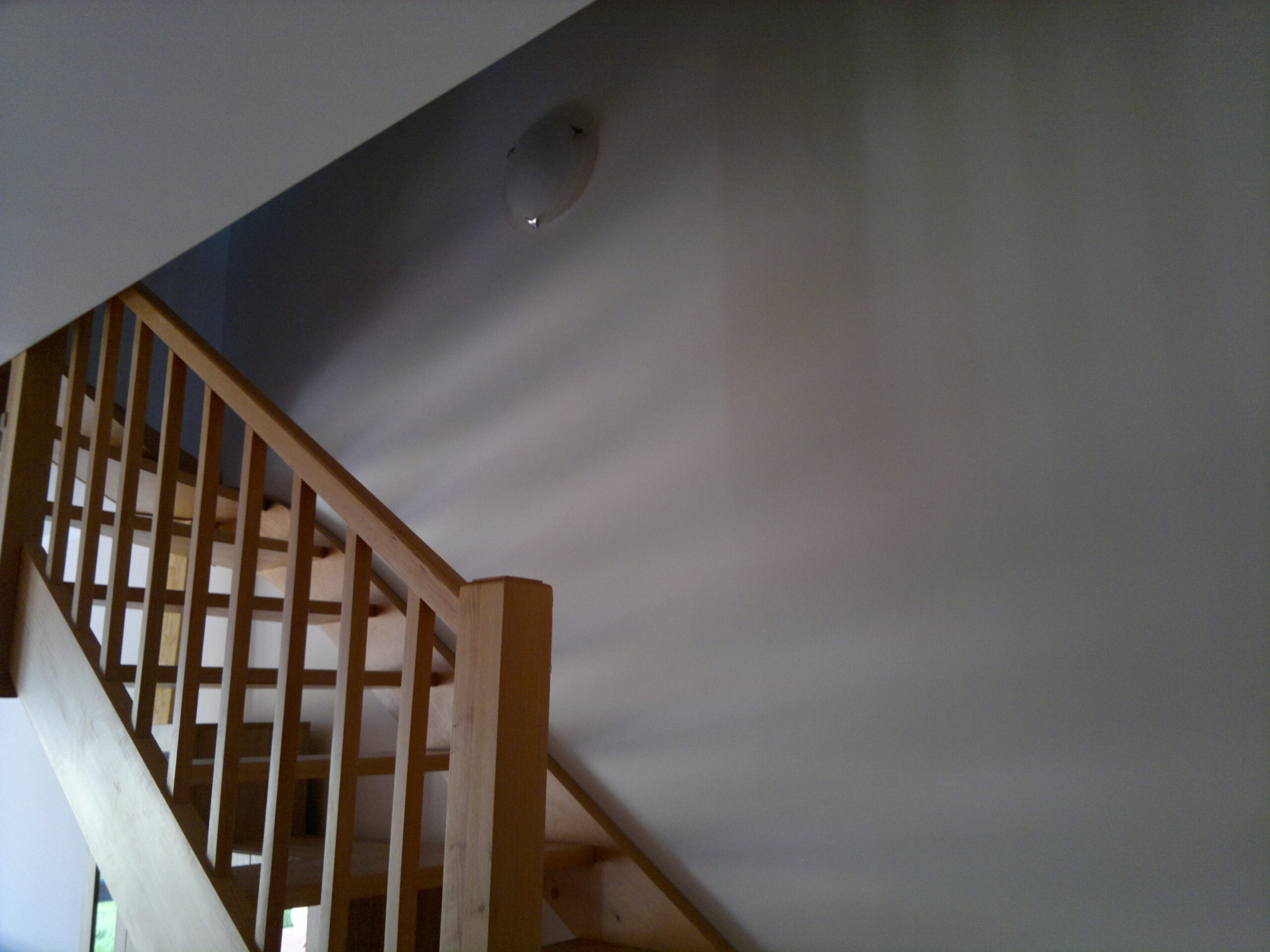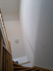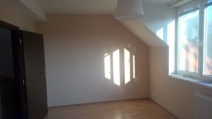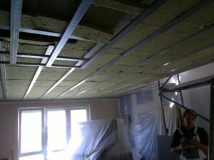 Suchá výstavba – akustický sádrokarton Modré ticho II a III etapa Rodinný dům Říčany, akustická předsazená stěna Rigips – úprava nedostatečné akustiky obvodové stěny řádového rodinného domu, rozebrání podkroví, vložení dodatečné izolace do stropní dutiny, úprava elektroinstalace předsazená stěna volně stojící akustická na CW a UW profilech 100 mm, vložená minerální izolace MPE 80 mm, zlepšení zvukové neprůzvučnosti až Rw o 28 dB., akustický podhled Rigips strop D112 zvuková neprozvučnost Rw 60db REI 30 minut, sádrokartonový ostrůvek v kuchyni, montáž a dodání LED bodového osvětlení Kanlux, výmalba.
